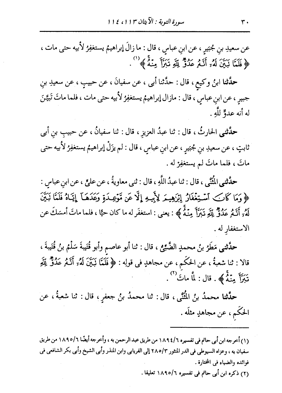 حَدَّثَنَا ابْنُ وَكِيعٍ، قَالَ: ثَنَا أَبِي، عَنْ سُفْيَانَ، عَنْ حَبِيبٍ، عَنْ سَعِيدِ بْنِ جُبَيْرٍ، عَنِ ابْنِ عَبَّاسٍ، قَالَ: «§مَازَالَ إِبْرَاهِيمُ يَسْتَغْفِرُ لِأَبِيهِ حَتَّى مَاتَ، فَلَمَّا مَاتَ تَبَيَّنَ لَهُ أَنَّهُ عَدُوٌّ لِلَّهِ»