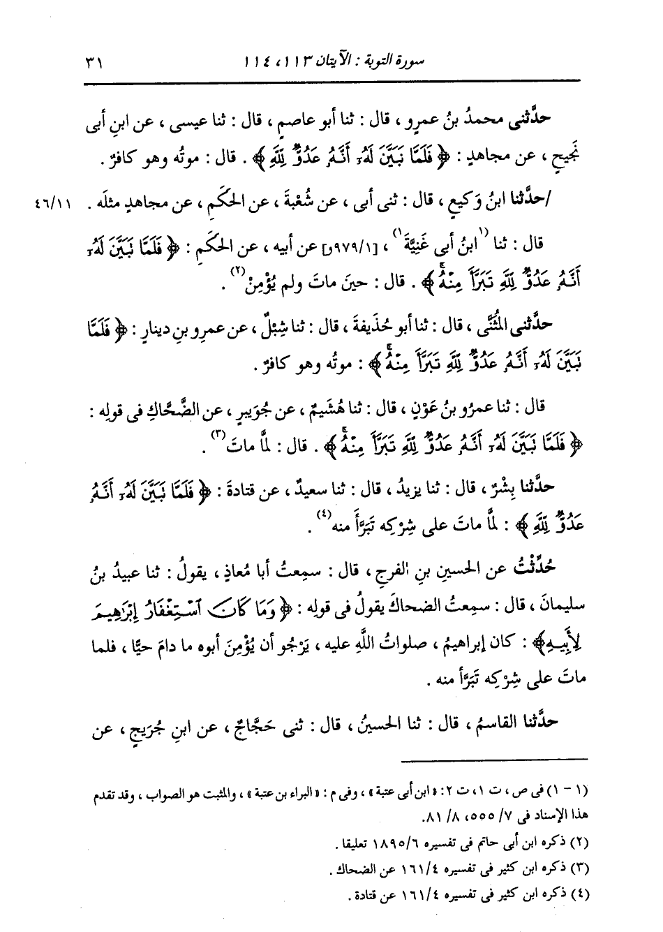 حَدَّثَنِي مُحَمَّدُ بْنُ عَمْرٍو، قَالَ: ثَنَا أَبُو عَاصِمٍ، قَالَ: ثَنَا عِيسَى، عَنِ ابْنِ أَبِي نَجِيحٍ، عَنْ مُجَاهِدٍ، " {§فَلَمَّا تَبَيَّنَ لَهُ أَنَّهُ عَدُوٌّ لِلَّهِ} [التوبة: 114] قَالَ: مَوْتَهُ وَهُوَ كَافِرٌ " حَدَّثَنَا ابْنُ وَكِيعٍ، قَالَ: ثَنِي أَبِي، عَنْ شُعْبَةَ، عَنِ الْحَكَمِ، عَنْ مُجَاهِدٍ، مِثْلَهُ