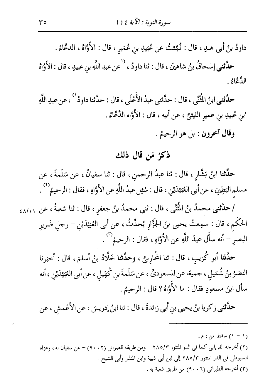 حَدَّثَنَا أَبُو كُرَيْبٍ، قَالَ: ثَنَا الْمُحَارِبِيُّ؛ وحَدَّثَنَا خَلَّادُ بْنُ أَسْلَمَ قَالَ: أَخْبَرَنَا النَّضْرُ بْنُ شُمَيْلِ جَمِيعًا، عَنِ الْمَسْعُودٍيِّ، عَنْ سَلَمَةَ بْنِ كُهَيْلٍ، عَنْ أَبِي الْعُبَيْدَيْنِ: أَنَّهُ سَأَلَ ابْنَ مَسْعُودٍ، فَقَالَ: §مَا الْأَوَّاهُ؟ قَالَ: «الرَّحِيمُ»