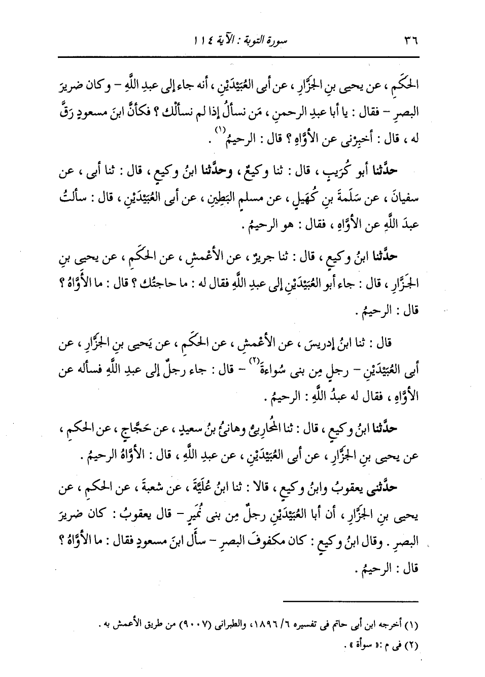 حَدَّثَنَا ابْنُ وَكِيعٍ، قَالَ: ثَنَا جَرِيرٌ، عَنِ الْأَعْمَشِ، عَنِ الْحَكَمِ، عَنْ يَحْيَى بْنِ الْجَزَّارِ، قَالَ: جَاءَ أَبُو الْعُبَيْدَيْنِ إِلَى عَبْدِ اللَّهِ، فَقَالَ لَهُ: «مَا حَاجَتُكَ؟» قَالَ: §مَا الْأَوَّاهُ؟ قَالَ: «الرَّحِيمُ»