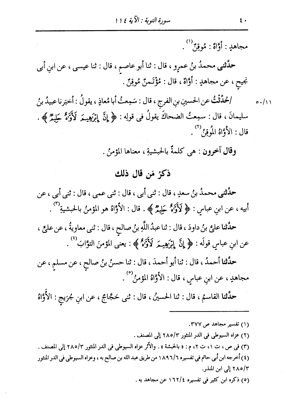 حُدِّثْتُ عَنِ الْحُسَيْنِ بْنِ الْفَرَجِ، قَالَ: سَمِعْتُ أَبَا مُعَاذٍ، يَقُولُ: أَخْبَرَنَا عُبَيْدُ بْنُ سُلَيْمَانَ، قَالَ: سَمِعْتُ الضَّحَّاكَ، يَقُولُ فِي قَوْلِهِ: " {§إِنَّ إِبْرَاهِيمَ لَأَوَّاهٌ حَلِيمٌ} [التوبة: 114] قَالَ: الْأَوَّاهُ: الْمُوقِنُ " وَقَالَ آخَرُونَ: هِيَ كَلِمَةٌ بِالْحَبَشِيَّةِ مَعْنَاهَا: الْمُؤْمِنُ. ذِكْرُ مَنْ قَالَ ذَلِكَ