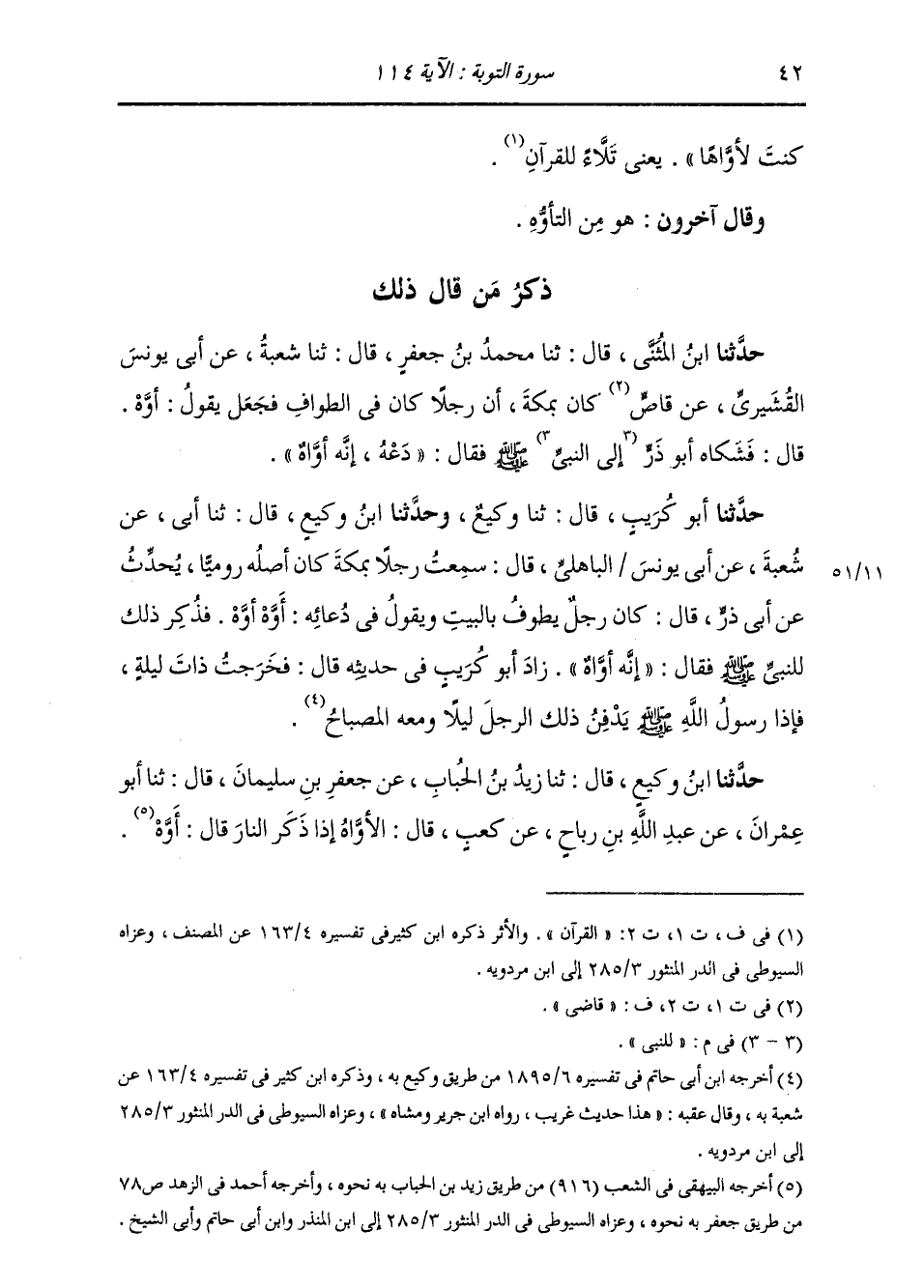 حَدَّثَنَا ابْنُ الْمُثَنَّى، قَالَ: ثَنَا مُحَمَّدُ بْنُ جَعْفَرٍ، قَالَ: ثَنَا شُعْبَةُ، عَنْ أَبِي يُونُسَ الْقُشَيْرِيِّ، عَنْ قَاصٍّ، كَانَ بِمَكَّةَ: أَنَّ §رَجُلًا، كَانَ فِي الطَّوَافِ، فَجَعَلَ يَقُولُ: أَوَّهْ قَالَ: فَشَكَاهُ أَبُو ذَرٍّ لِلنَّبِيِّ صَلَّى اللهُ عَلَيْهِ وَسَلَّمَ فَقَالَ: «دَعْهُ إِنَّهُ أَوَّاهٌ»