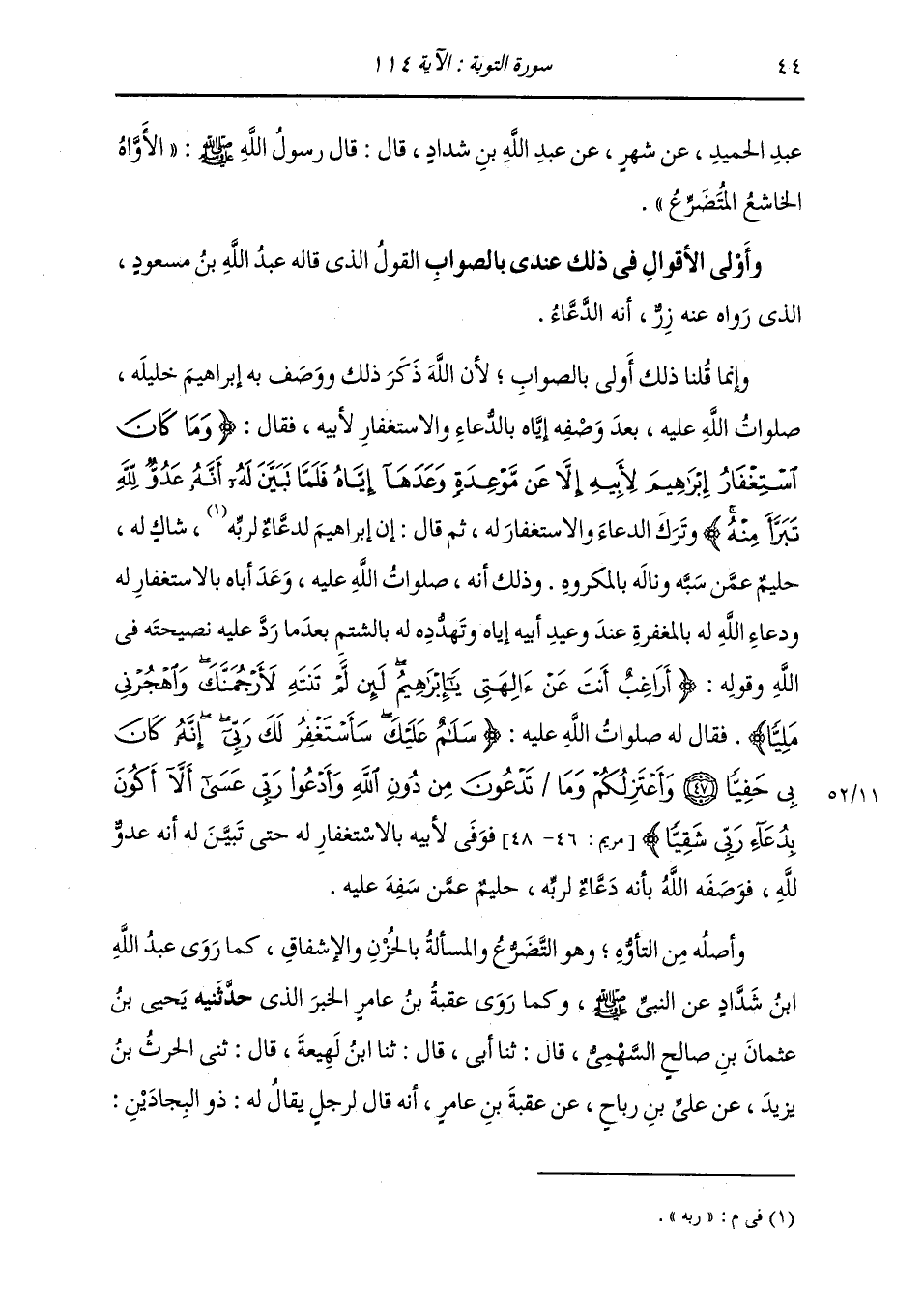 -[46]- قَالَ: وَرُبَّمَا أَنْشَدَنَا «فَأَوَّ مِنَ الذِّكْرَى» بِغَيْرِ هَاءٍ. وَلَوْ جَاءَ فَعَلَ مِنْهُ عَلَى الْأَصْلِ لَكَانَ آهَ يَئُوهُ أَوَّهَا. وَلِأَنَّ مَعْنَى ذَلِكَ: تَوَجُّعٌ وَتَحَزُّنٌ وَتَضَرُّعٌ، اخْتَلَفَ أَهْلُ التَّأْوِيلِ فِيهِ الِاخْتِلَافَ الَّذِي ذَكَرْتُ، فَقَالَ مَنْ قَالَ مَعْنَاهُ الرَّحْمَةُ: أَنَّ ذَلِكَ كَانَ مِنْ إِبْرَاهِيمَ عَلَى وَجْهِ الرِّقَةِ عَلَى أَبِيهِ وَالرَّحْمَةِ لَهُ وَلِغَيْرِهِ مِنَ النَّاسِ. وَقَالَ آخَرُونَ: إِنَّمَا كَانَ ذَلِكَ مِنْهُ لِصِحَّةِ يَقِينِهِ وَحُسْنِ مَعْرِفَتِهِ بِعَظَمَةِ اللَّهِ وَتَوَاضُعِهِ لَهُ. وَقَالَ آخَرُونَ: كَانَ لِصِحَّةِ إِيمَانِهِ بِرَبِهِ. وَقَالَ آخَرُونَ: كَانَ ذَلِكَ مِنْهُ عِنْدَ تِلَاوَتِهِ تَنْزِيلَ اللَّهِ الَّذِي أَنْزَلَ عَلَيْهِ. وَقَالَ آخَرُونَ: كَانَ ذَلِكَ مِنْهُ عِنْدَ ذِكْرِ رَبِّهِ. وَكُلُّ ذَلِكَ عَائِدٌ إِلَى مَا قُلْتُ، وَتَقَارَبَ مَعْنَى بَعْضِ ذَلِكَ مِنْ بَعْضٍ؛ لِأَنَّ الْحَزِينَ الْمُتَضَرِّعَ إِلَى رَبِّهِ الْخَاشِعَ لَهُ بِقَلْبِهِ، يَنُوبُهُ ذَلِكَ عِنْدَ مَسْأَلَتِهِ رَبَّهُ وَدُعَائِهِ إِيَّاهُ فِي حَاجَاتِهِ، وَتَعْتَوِرُهُ هَذِهِ الْخِلَالُ الَّتِي وَجَّهَ الْمُفَسِّرُونَ إِلَيْهَا تَأْوِيلَ قَوْلِ اللَّهِ: {إِنَّ إِبْرَاهِيمَ لَأَوَّاهٌ حَلِيمٌ} [التوبة: 114]