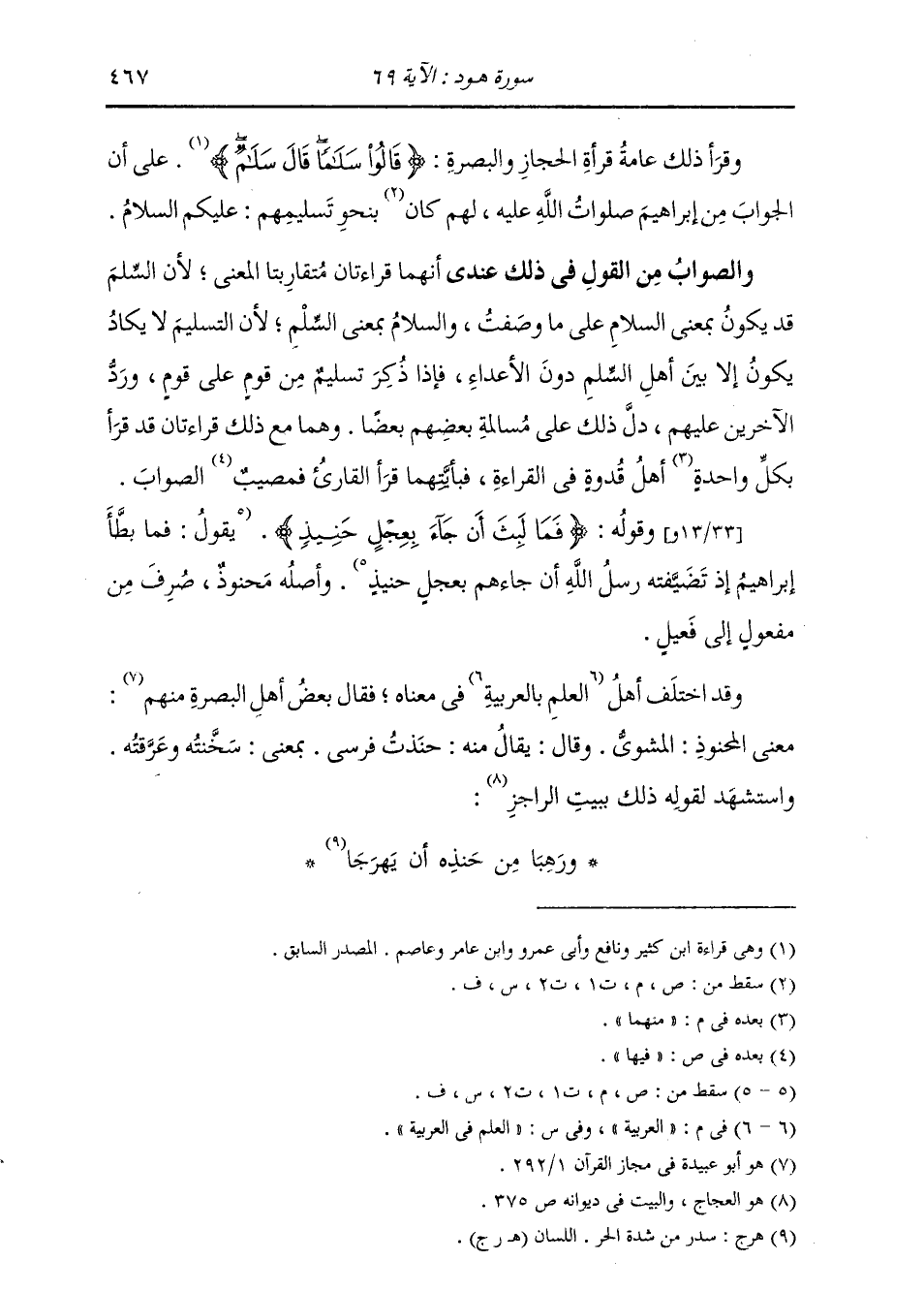 وَقَرَأَ ذَلِكَ عَامَّةُ قُرَّاءِ الْحِجَازِ وَالْبَصْرَةِ {قَالُوا سَلَامًا قَالَ سَلَامٌ} [هود: 69] عَلَى أَنَّ الْجَوَابَ مِنْ إِبْرَاهِيمَ صَلَّى اللهُ عَلَيْهِ وَسَلَّمَ لَهُمْ، بِنَحْوِ تَسْلِيمِهِمْ، عَلَيْكُمُ السَّلَامُ. وَالصَّوَابُ مِنَ الْقَوْلِ فِي ذَلِكَ عِنْدِي: أَنَّهُمَا قِرَاءَتَانِ مُتَقَارِبَتَا الْمَعْنَى، لِأَنَّ السِّلْمَ قَدْ يَكُونُ بِمَعْنَى السَّلَامِ عَلَى مَا وَصَفْتُ، وَالسَّلَامَ بِمَعْنَى السِّلْمِ، لِأَنَّ التَّسْلِيمَ لَا يَكَادُ يَكُونُ إِلَّا بَيْنَ أَهْلِ السِّلْمِ دُونَ الْأَعْدَاءِ، فَإِذَا ذُكِرَ تَسْلِيمٌ مِنْ قَوْمٍ عَلَى قَوْمٍ وَرَدَّ الْآخَرِينَ عَلَيْهِمْ، دَلَّ ذَلِكَ عَلَى مُسَالَمَةِ بَعْضِهِمْ بَعْضًا. وَهُمَا مَعَ ذَلِكَ قِرَاءَتَانِ قَدْ قَرَأَ بِكُلِّ وَاحِدَةٍ مِنْهُمَا أَهْلُ قُدْوَةٍ فِي الْقِرَاءَةِ، فَبِأَيَّتِهِمَا قَرَأَ الْقَارِئُ فَمُصِيبٌ الصَّوَابَ. وَقَوْلُهُ: {فَمَا لَبِثَ أَنْ جَاءَ بِعِجْلٍ حَنِيذٍ} [هود: 69] وَأَصْلُهُ مَحْنُوذٍ، صُرِفَ مِنْ مَفْعُولٍ إِلَى فَعِيلٍ. وَقَدِ اخْتَلَفَ أَهْلُ الْعَرَبِيَّةِ فِي مَعْنَاهُ، فَقَالَ بَعْضُ أَهْلِ الْبَصْرَةِ مِنْهُمْ: مَعْنَى الْمَحْنُوذِ: الْمَشْوِي، قَالَ: وَيُقَالُ مِنْهُ: حَنَذْتُ فَرَسِي، بِمَعْنَى سَخَّنْتُهُ وَعَرَّقْتُهُ. وَاسْتَشْهَدَ لِقَوْلِهِ ذَلِكَ بِبَيْتِ الرَّاجِزِ: