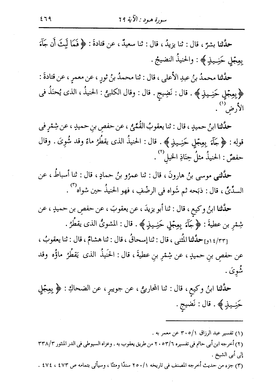حَدَّثَنِي مُوسَى بْنُ هَارُونَ، قَالَ: ثَنَا عَمْرُو بْنُ حَمَّادٍ، قَالَ: ثَنَا أَسْبَاطٌ، عَنِ السُّدِّيِّ، قَالَ: «§ذَبَحَهُ ثُمَّ شَوَاهُ فِي الرَّضْفِ فَهُوَ الْحَنِيذُ حِينَ شَوَاهُ»
