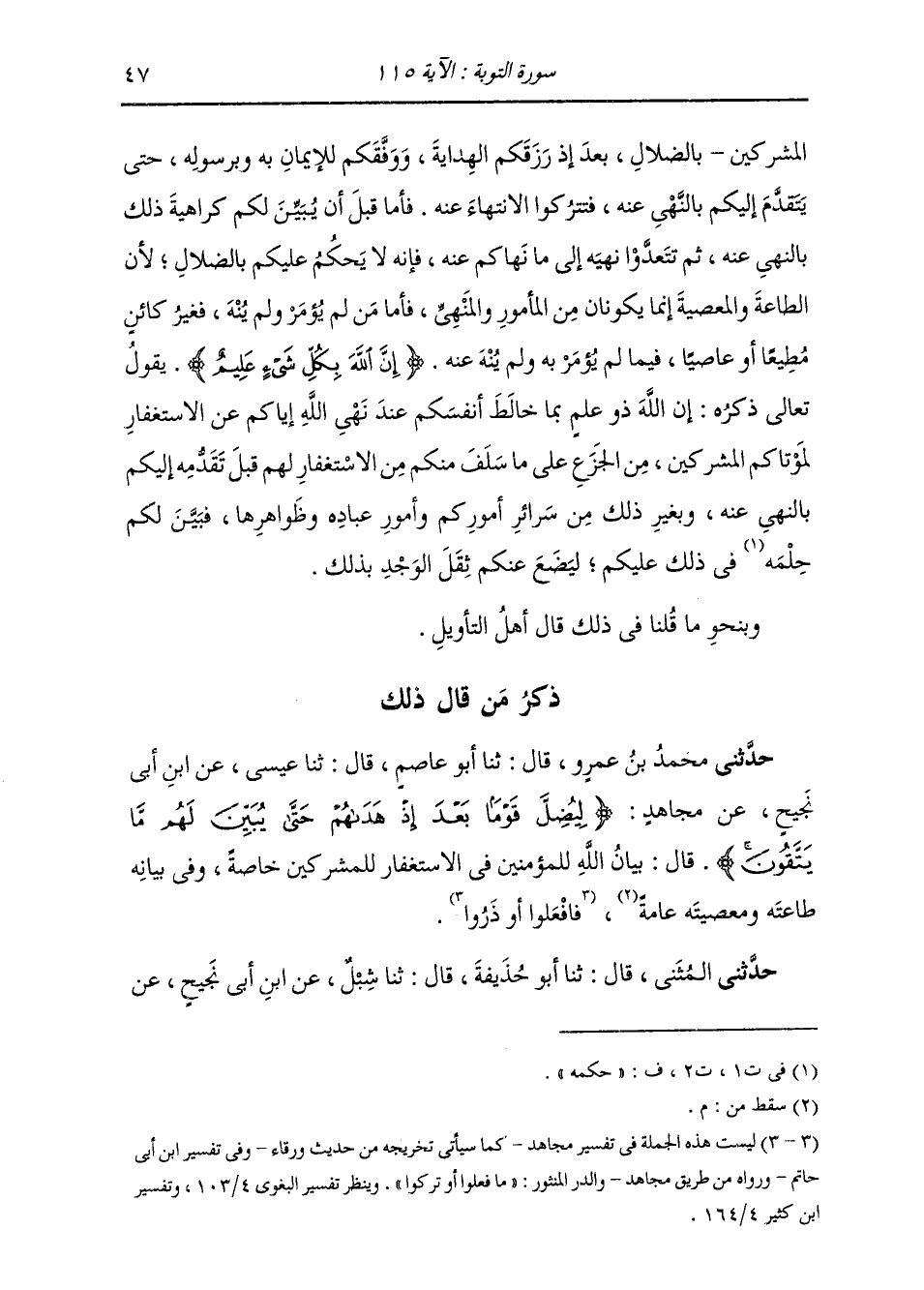 حَدَّثَنِي الْمُثَنَّى، قَالَ: ثَنَا أَبُو حُذَيْفَةَ، قَالَ: ثَنَا شِبْلٌ، عَنِ ابْنِ أَبِي نَجِيحٍ، عَنْ -[48]- مُجَاهِدٍ: " {§وَمَا كَانَ اللَّهُ لِيُضِلَّ قَوْمًا بَعْدَ إِذْ هَدَاهُمْ حَتَّى يُبَيِّنَ لَهُمْ مَا يَتَّقُونَ} [التوبة: 115] قَالَ: بَيَانُ اللَّهِ لِلْمُؤْمِنِينَ أَنْ لَّا يَسْتَغْفِرُوا لِلْمُشْرِكِينَ خَاصَّةً، وَفِي بَيَانِهِ طَاعَتَهُ وَمَعْصِيَتَهُ عَامَّةً، فَافْعَلُوا أَوْ ذَرُوا " قَالَ ثَنَا إِسْحَاقُ، قَالَ: ثَنَا عَبْدُ اللَّهِ، عَنْ وَرْقَاءَ، عَنِ ابْنِ أَبِي نَجِيحٍ، عَنْ مُجَاهِدٍ، نَحْوَهُ
