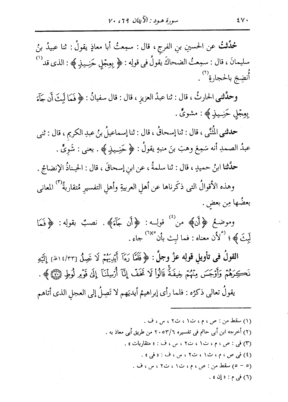 ابْنُ حُمَيْدٍ، قَالَ: ثَنَا سَلَمَةُ، عَنِ ابْنِ إِسْحَاقَ، قَالَ: " §الْحَنَاذُ: الْإِنْضَاجُ " قَالَ أَبُو جَعْفَرٍ: وَهَذِهِ الْأَقْوَالُ الَّتِي ذَكَرْنَاهَا عَنْ أَهْلِ الْعَرَبِيَّةِ وَأَهْلِ التَّفْسِيرِ، مُتَقَارِبَاتُ الْمَعَانِي بَعْضُهَا مِنْ بَعْضٍ، وَمَوْضِعُ «أَنْ» فِي قَوْلِهِ: {أَنْ جَاءَ بِعِجْلٍ حَنِيذٍ} [هود: 69] نُصِبَ بِقَوْلِهِ: «فَمَا لَبِثَ أَنْ جَاءَ»