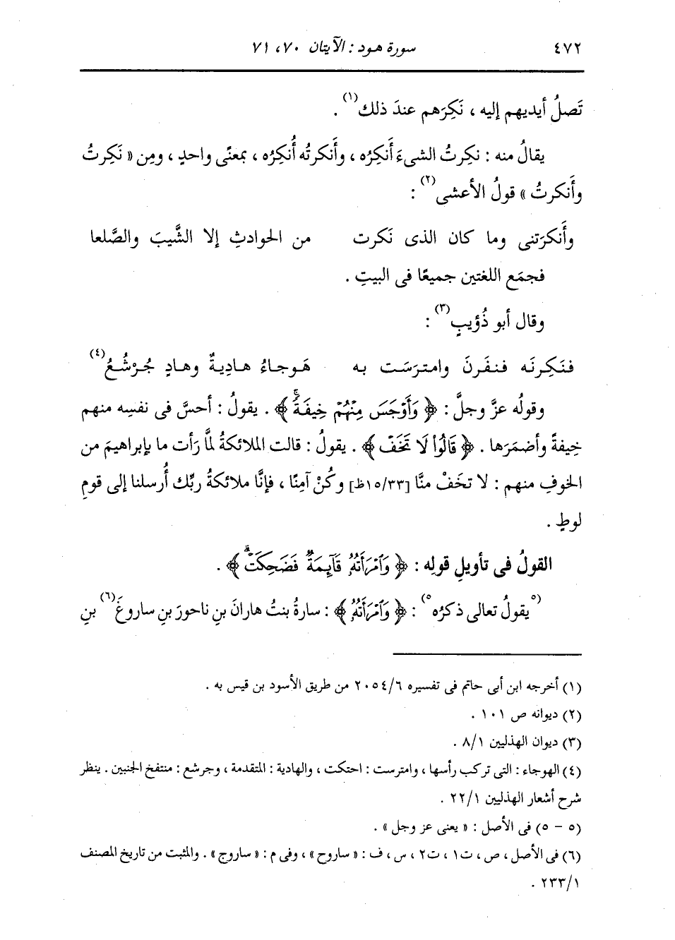 §الْقَوْلُ فِي تَأْوِيلِ قَوْلِهِ تَعَالَى: {وَامْرَأَتُهُ قَائِمَةٌ فَضَحِكَتْ فَبَشَّرْنَاهَا بِإِسْحَاقَ وَمِنْ وَرَاءِ إِسْحَاقَ يَعْقُوبَ} يَقُولُ تَعَالَى ذِكْرُهُ: {وَامْرَأَتُهُ} [هود: 71] سَارَةُ بِنْتُ هَارَانَ بْنِ نَاحُورَ بْنِ سَارُوجَ بْنِ -[473]- رَاعُو بْنِ فَالِغَ، وَهِيَ ابْنَةُ عَمِّ إِبْرَاهِيمَ. {قَائِمَةٌ} [آل عمران: 113] قِيلَ: كَانَتْ قَائِمَةٌ مِنْ وَرَاءِ السِّتْرِ تَسْتَمِعُ كَلَامَ الرُّسُلِ، وَكَلَامَ إِبْرَاهِيمَ عَلَيْهِ السَّلَامُ. وَقِيلَ: كَانَتْ قَائِمَةٌ تَخْدُمُ الرُّسُلُ، وَإِبْرَاهِيمُ جَالِسٌ مَعَ الرُّسُلِ، وَقَوْلُهُ: {فَضَحِكَتْ} [هود: 71] اخْتَلَفَ أَهْلُ التَّأْوِيلِ فِي مَعْنَى قَوْلِهِ {فَضَحِكَتْ} [هود: 71] وَفِي السَّبَبِ الَّذِي مِنْ أَجَلِهِ ضَحِكَتْ، فَقَالَ بَعْضُهُمْ: ضَحِكَتِ الضَّحِكَ الْمَعْرُوفِ تَعَجُّبًا مِنْ أَنَّهَا وَزَوْجَهَا إِبْرَاهِيمَ يَخْدُمَانِ ضِيفَانَهُمْ بِأَنْفُسِهِمَا تَكْرُمَةً لَهُمْ، وَهُمْ عَنْ طَعَامِهِمْ مُمْسِكُونَ لَا يَأْكُلُونَ ذِكْرُ مَنْ قَالَ ذَلِكَ: