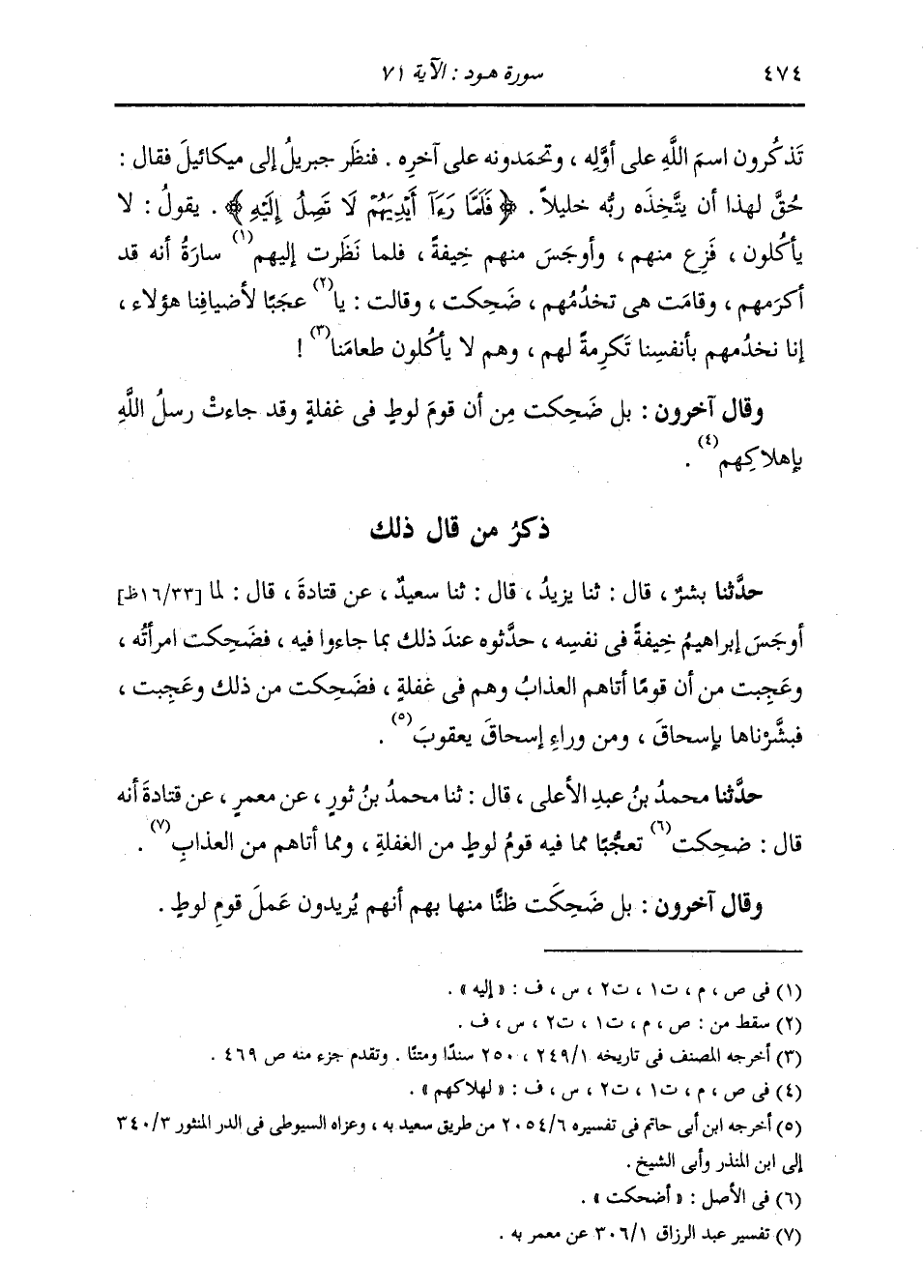 حَدَّثَنَا بِشْرٌ، قَالَ: ثَنَا يَزِيدُ، قَالَ: ثَنَا سَعِيدٌ، عَنْ قَتَادَةَ، قَالَ: «§لَمَّا أَوْجَسَ إِبْرَاهِيمُ خِيفَةً فِي نَفْسِهِ حَدَّثُوهُ عِنْدَ ذَلِكَ بِمَا جَاءُوا فِيهِ، فَضَحِكَتِ امْرَأَتُهُ وَعَجِبَتْ مِنْ أَنَّ قَوْمًا أَتَاهُمُ الْعَذَابُ، وَهُمْ فِي غَفْلَةٍ، فَضَحِكَتْ مِنْ ذَلِكَ وَعَجِبَتْ، فَبَشَّرْنَاهَا بِإِسْحَاقَ، وَمِنْ وَرَاءِ إِسْحَاقَ يَعْقُوبَ»