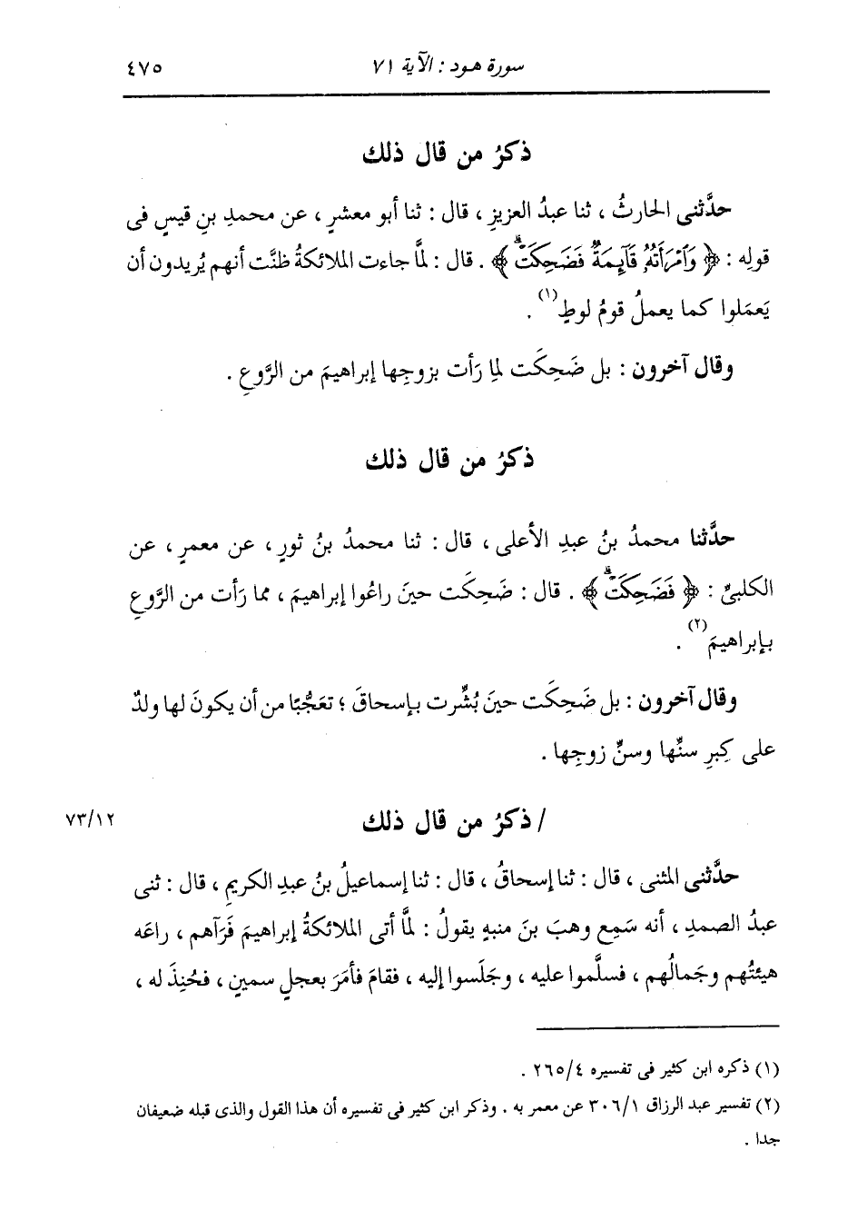 حَدَّثَنِي الْمُثَنَّى، قَالَ: ثَنَا إِسْحَاقُ، قَالَ: ثَنَا إِسْمَاعِيلُ بْنُ عَبْدِ الْكَرِيمِ، قَالَ: ثَنِي عَبْدُ الصَّمَدِ أَنَّهُ سَمِعَ وَهْبَ بْنَ مُنَبِّهٍ يَقُولُ: " §لَمَّا أَتَى الْمَلَائِكَةُ إِبْرَاهِيمَ عَلَيْهِ السَّلَامُ فَرَآهُمْ، رَاعَهُ هَيْئَتُهُمْ وَجَمَالُهُمْ، فَسَلَّمُوا عَلَيْهِ، وَجَلَسُوا إِلَيْهِ، فَقَامَ فَأَمَرَ بِعِجْلٍ سَمِينٍ، فُحُنِذَ لَهُ، -[476]- فَقَرَّبَ إِلَيْهِمُ الطَّعَامَ، فَلَمَّا رَأَى أَيْدِيَهُمْ لَا تَصِلُ إِلَيْهِ نَكِرَهُمْ، وَأَوْجَسَ مِنْهُمْ خِيفَةً، وَسَارَةُ وَرَاءَ الْبَيْتِ تَسْمَعُ؛ قَالُوا: لَا تَخَفْ إِنَّا نُبَشِّرُكَ بِغُلَامٍ حَلِيمٍ مُبَارَكٍ وَبَشَّرَ بِهِ امْرَأَتَهُ سَارَةَ، فَضَحِكَتْ، وَعَجِبَتْ كَيْفَ يَكُونُ لِي وَلَدٌ وَأَنَا عَجُوزٌ، وَهُوَ شَيْخٌ كَبِيرٌ فَقَالُوا: أَتَعْجَبِينَ مِنْ أَمْرِ اللَّهِ؟ فَإِنَّهُ قَادِرٌ عَلَى مَا يَشَاءُ، فَقَدْ وَهَبَهُ اللَّهُ لَكُمْ فَأَبْشِرُوا بِهِ " وَقَدْ قَالَ بَعْضُ مَنْ كَانَ يَتَأَوَّلُ هَذَا التَّأْوِيلَ: إِنَّ هَذَا مِنَ الْمُقَدَّمِ الَّذِي مَعْنَاهُ التَّأْخِيرُ، وَكَانَ مَعْنَى الْكَلَامِ عِنْدَهُ: وَامْرَأَتُهُ قَائِمَةٌ، فَبَشَّرْنَاهَا بِإِسْحَاقَ، وَمِنْ وَرَاءِ إِسْحَاقَ يَعْقُوبَ، فَضَحِكَتْ وَقَالَتْ: {يَا وَيْلَتَى أَأَلِدُ وَأَنَا عَجُوزٌ} [هود: 72] وَقَالَ آخَرُونَ: بَلْ مَعْنَى قَوْلِهِ: «فَضَحِكَتْ» فِي هَذَا الْمَوْضِعِ: فَحَاضَتْ ذِكْرُ مَنْ قَالَ ذَلِكَ: