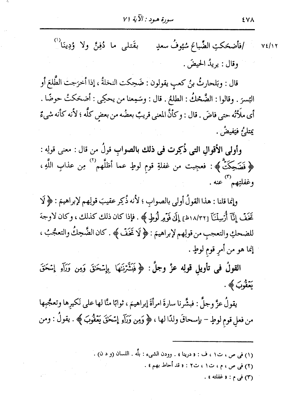 وَقَالَ: يُرِيدُ الْحَيْضَ. قَالَ: وَبَلْحَرِثِ بْنِ كَعْبٍ يَقُولُونَ: ضَحِكَتِ النَّخْلَةُ: إِذَا أَخْرَجَتِ الطَّلْعَ أَوْ الْبُسْرَ. وَقَالُوا: الضَّحْكَ: الطَّلْعَ. قَالَ: وَسَمِعْنَا مَنْ يَحْكِي: أَضْحَكْتُ حَوْضًا: أَيْ مَلَأْتُهُ حَتَّى فَاضَ. قَالَ: وَكَأَنَّ الْمَعْنَى قَرِيبٌ بَعْضُهُ مِنْ بَعْضٍ كُلَّهُ، لِأَنَّهُ كَأَنَّهُ شَيْءٌ يَمْتَلِئُ فَيَفِيضُ. وَأَوْلَى الْأَقْوَالِ الَّتِي ذُكِرَتْ فِي ذَلِكَ بِالصَّوَابِ قَوْلُ مَنْ قَالَ: مَعْنَى قَوْلِهِ: «فَضَحِكَتْ» : فَعَجِبَتْ مِنْ غَفْلَةِ قَوْمِ لُوطٍ عَمَّا قَدْ أَحَاطَ بِهِمْ مِنْ عَذَابِ اللَّهِ وَغَفْلَتِهِمْ عَنْهُ. وَإِنَّمَا قُلْنَا هَذَا الْقَوْلَ أَوْلَى بِالصَّوَابِ لِأَنَّهُ ذُكِرَ عَقِيبُ قَوْلِهِمْ لِإِبْرَاهِيمَ: لَا تَخَفْ إِنَّا أُرْسِلْنَا إِلَى قَوْمِ لُوطٍ. فَإِذْ كَانَ ذَلِكَ كَذَلِكَ، وَكَانَ لَا وَجْهَ لِلْضَحِكِ، وَالتَّعَجُّبِ مِنْ قَوْلِهِمْ لِإِبْرَاهِيمَ: لَا تَخَفْ، كَانَ الضَّحِكُ وَالتَّعَجُّبِ إِنَّمَا هُوَ مِنْ أَمْرِ قَوْمِ لُوطٍ