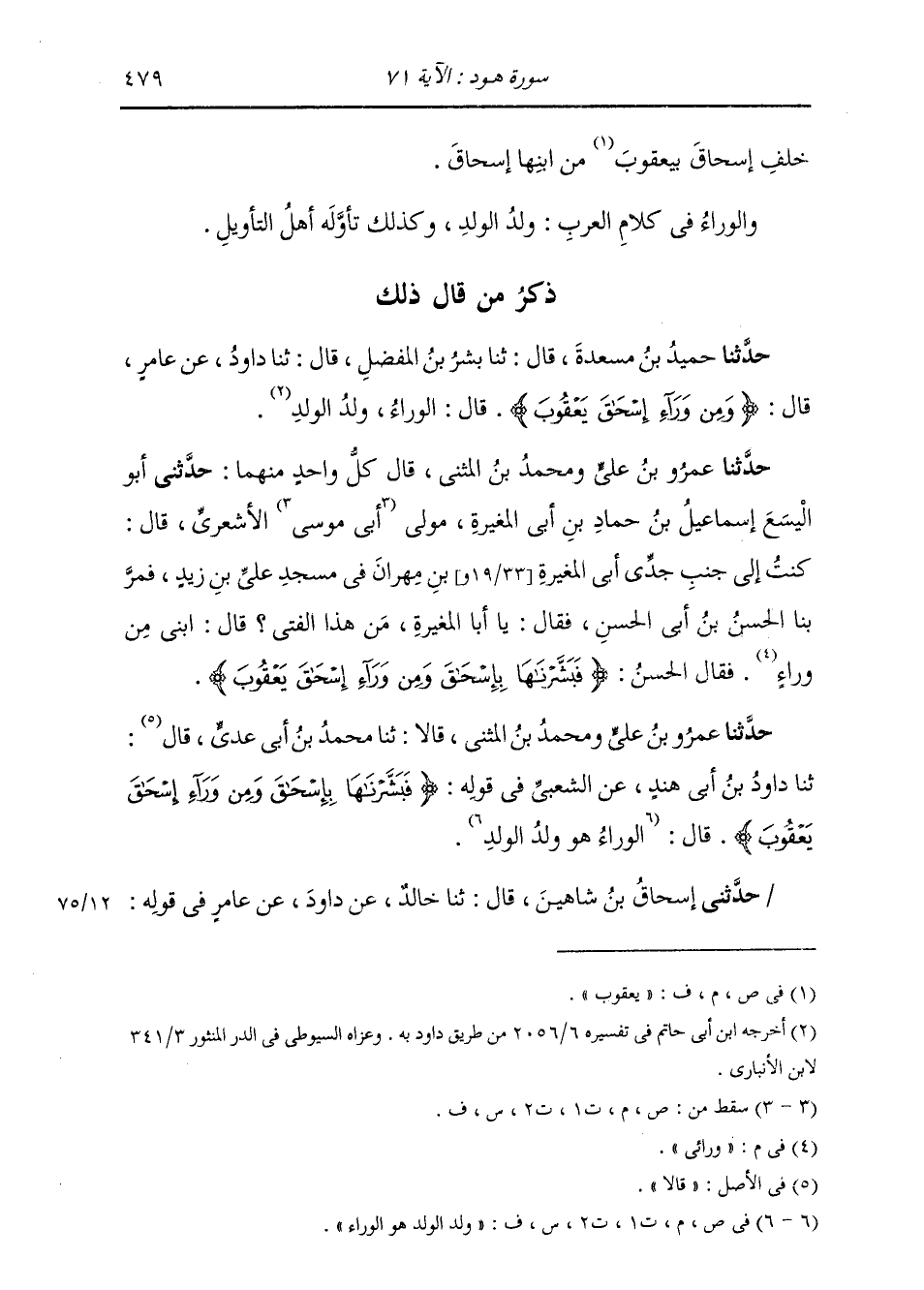 حَدَّثَنِي إِسْحَاقُ بْنُ شَاهِينَ، قَالَ: ثَنَا خَالِدٌ، عَنْ دَاوُدَ، عَنْ عَامِرٍ، فِي قَوْلِهِ: " {§-[480]- وَمِنْ وَرَاءِ إِسْحَاقَ يَعْقُوبَ} قَالَ: الْوَرَاءُ: وَلَدُ الْوَلَدِ " حَدَّثَنِي يَعْقُوبُ بْنُ إِبْرَاهِيمَ، قَالَ: ثَنَا ابْنُ عُلَيَّةَ، عَنْ دَاوُدَ، عَنِ الشَّعْبِيِّ، مِثْلَهُ