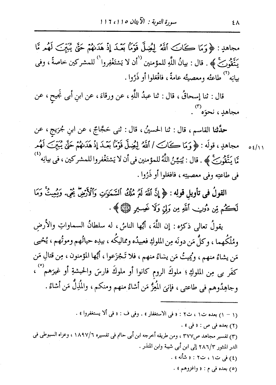 حَدَّثَنَا الْقَاسِمُ، قَالَ: ثَنَا الْحُسَيْنُ، قَالَ: ثَنِي حَجَّاجٌ، عَنِ ابْنِ جُرَيْجٍ، عَنْ مُجَاهِدٍ، قَوْلُهُ: " {§وَمَا كَانَ اللَّهُ لِيُضِلَّ قَوْمًا بَعْدَ إِذْ هَدَاهُمْ حَتَّى يُبَيِّنَ لَهُمْ مَا يَتَّقُونَ} [التوبة: 115] قَالَ: يُبَيِّنُ اللَّهُ لِلْمُؤْمِنِينَ فِي أَنْ لَّا يَسْتَغْفِرُوا لِلْمُشْرِكِينَ فِي بَيَانِهِ فِي طَاعَتِهِ وَفِي مَعْصِيَتِهِ، فَافْعَلُوا أَوْ ذَرُوا "