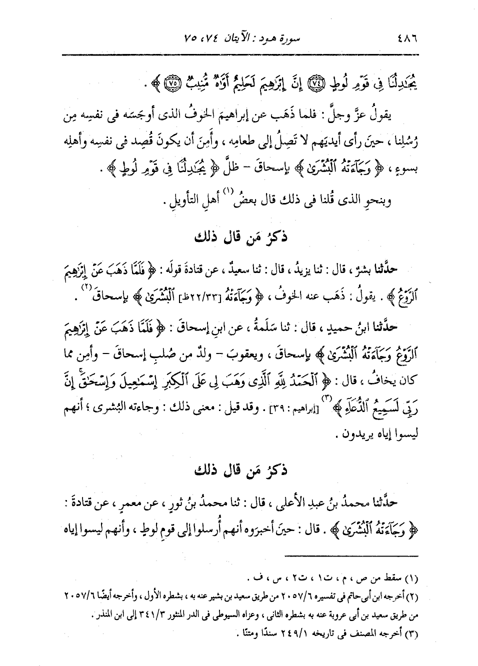 حَدَّثَنَا ابْنُ حُمَيْدٍ، قَالَ: ثَنَا سَلَمَةُ، عَنِ ابْنِ إِسْحَاقَ، " {§فَلَمَّا ذَهَبَ عَنْ إِبْرَاهِيمَ الرَّوْعُ وَجَاءَتْهُ الْبُشْرَى،} [هود: 74] بِإِسْحَاقَ، وَيَعْقُوبَ وَلَدًا مِنْ صُلْبِ إِسْحَاقَ، وَأَمِنَ مِمَّا كَانَ يَخَافُ؛ قَالَ: {الْحَمْدُ لِلَّهِ الَّذِي وَهْبَ لِي عَلَى الْكِبَرِ إِسْمَاعِيلَ وَإِسْحَاقَ إِنَّ رَبِّيَ لَسَمِيعُ الدُّعَاءِ} " وَقَدْ قِيلَ مَعْنَى ذَلِكَ: وَجَاءَتْهُ الْبُشْرَى أَنَّهُمْ لَيْسُوا إِيَّاهُ يُرِيدُونَ ذِكْرُ مَنْ قَالَ ذَلِكَ: