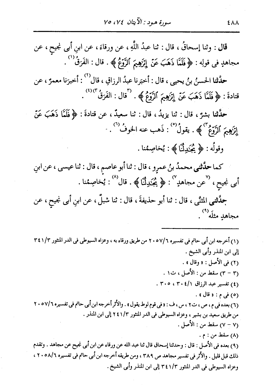 حَدَّثَنِي مُحَمَّدُ بْنُ عَمْرٍو، قَالَ: ثَنَا أَبُو عَاصِمٍ، قَالَ: ثَنَا عِيسَى، عَنِ ابْنِ أَبِي نَجِيحٍ، عَنْ مُجَاهِدٍ، " {§يُجَادِلُنَا} [هود: 74] يُخَاصِمُنَا " حَدَّثَنِي الْمُثَنَّى، قَالَ: ثَنَا أَبُو حُذَيْفَةَ، قَالَ: ثَنَا شِبْلٌ، عَنِ ابْنِ أَبِي نَجِيحٍ، عَنْ مُجَاهِدٍ، مِثْلَهُ