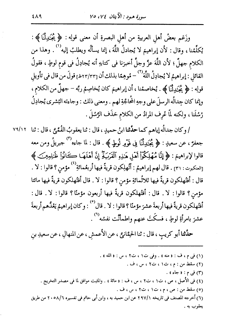 حَدَّثَنَا ابْنُ حُمَيْدٍ، قَالَ: ثَنَا يَعْقُوبُ الْقُمِّيُّ، قَالَ: ثَنَا جَعْفَرٌ، عَنْ سَعِيدٍ، " {§يُجَادِلُنَا فِي قَوْمِ لُوطٍ} [هود: 74] قَالَ: لَمَّا جَاءَ جَبْرَئِيلُ، وَمَنْ مَعَهُ قَالُوا لِإِبْرَاهِيمَ: {إِنَّا مُهْلِكُو أَهْلِ هَذِهِ الْقَرْيَةِ إِنَّ أَهْلَهَا كَانُوا ظَالِمِينَ} [العنكبوت: 31] قَالَ لَهُمْ إِبْرَاهِيمُ: أَتُهْلِكُونَ قَرْيَةً فِيهَا أَرْبَعُ مِائَةِ مُؤْمِنٍ؟ قَالُوا: لَا، قَالَ: أَفَتُهْلِكُونَ قَرْيَةً فِيهَا ثَلَاثُ مِائَةِ مُؤْمِنٍ؟ قَالُوا: لَا. قَالَ: أَفَتُهْلِكُونَ قَرْيَةً فِيهَا مِئَتَا مُؤْمِنٍ؟ قَالُوا: لَا. قَالَ: أَفَتُهْلِكُونَ قَرْيَةً فِيهَا أَرْبَعُونَ مُؤْمِنًا؟ قَالُوا: لَا. قَالَ: أَفَتُهْلِكُونَ قَرْيَةً فِيهَا أَرْبَعَةَ عَشَرَ مُؤْمِنًا؟ قَالُوا: لَا. وَكَانَ إِبْرَاهِيمُ يَعَدُّهُمْ أَرْبَعَةَ عَشَرَ بِامْرَأَةِ لُوطٍ، فَسَكَتَ عَنْهُمْ، وَاطْمَأَنَّتْ نَفْسُهُ "