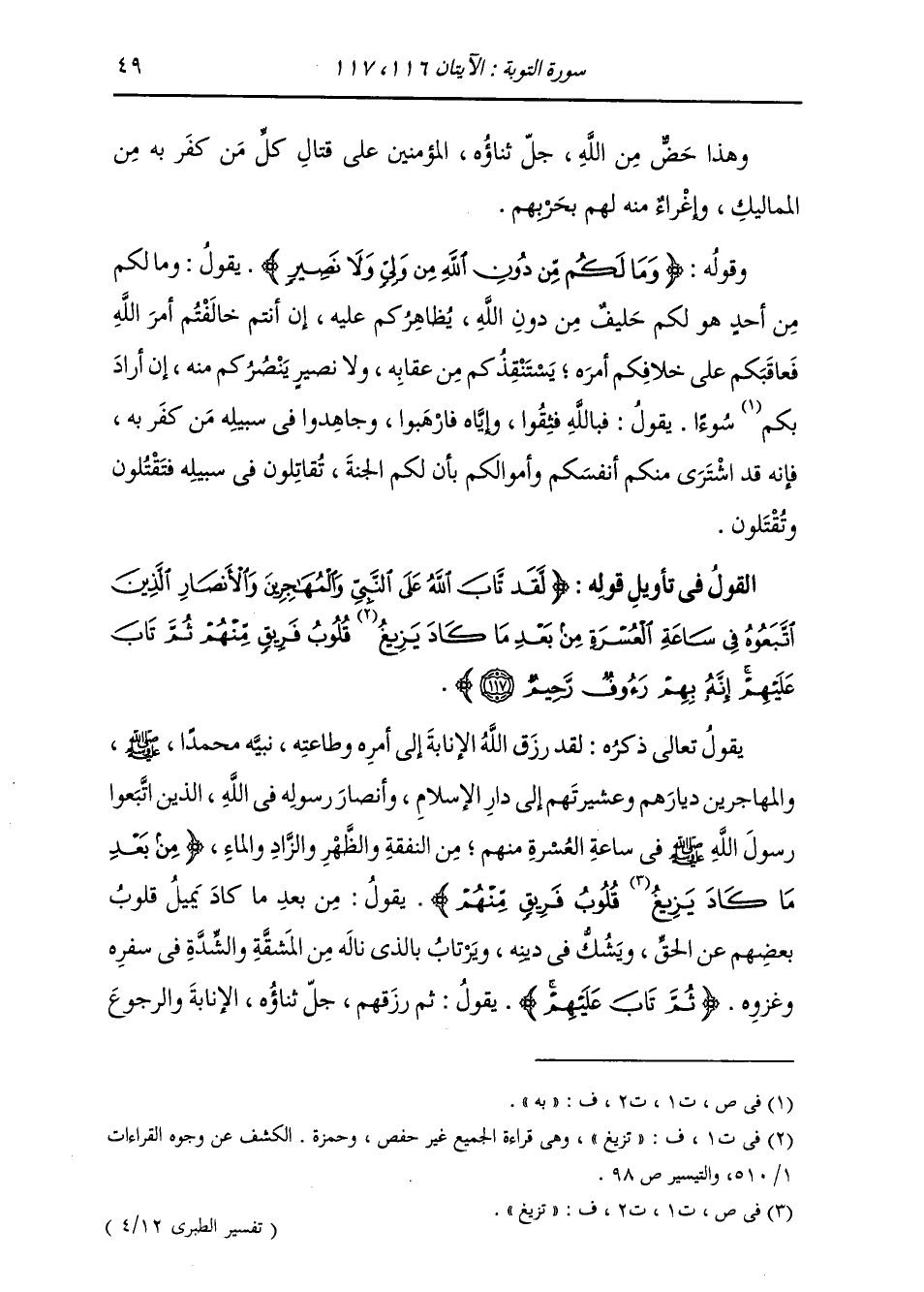 §الْقَوْلُ فِي تَأْوِيلِ قَوْلِهِ تَعَالَى: {لَقَدْ تَابَ اللَّهُ عَلَى النَّبِيِّ وَالْمُهَاجِرِينَ وَالْأَنْصَارِ الَّذِينَ اتَّبَعُوهُ فِي سَاعَةِ الْعُسْرَةِ مِنْ بَعْدِ مَا كَادَ يَزِيغُ قُلُوبُ فَرِيقٍ مِنْهُمْ ثُمَّ تَابَ عَلَيْهِمْ إِنَّهُ بِهِمْ رَءُوفٌ رَّحِيمٌ} يَقُولُ تَعَالَى ذِكْرُهُ: لَقَدْ رَزَقَ اللَّهُ الْإِنَابَةَ إِلَى أَمْرِهِ وَطَاعَتِهِ نَبِيَّهُ مُحَمَّدًا صَلَّى اللهُ عَلَيْهِ وَسَلَّمَ، وَالْمُهَاجِرِينَ دِيَارَهُمْ وَعَشِيرَتَهُمْ إِلَى دَارِ الْإِسْلَامِ، وَأَنْصَارَ رَسُولِهِ فِي اللَّهِ، الَّذِينَ اتَّبَعُوا رَسُولَ اللَّهِ فِي سَاعَةِ الْعُسْرَةِ مِنْهُمْ مِنَ النَّفَقَةِ وَالظَّهْرِ وَالزَّادِ وَالْمَاءِ {مِنْ بَعْدَ مَا كَادَ يَزِيغُ قُلُوبُ فَرِيقٍ مِنْهُمْ} [التوبة: 117] يَقُولُ: مِنْ بَعْدَ مَا كَادَ يَمِيلُ قُلُوبُ بَعْضِهِمْ عَنِ الْحَقِّ وَيَشُكُّ فِي دِينِهِ وَيَرْتَابُ بِالَّذِي نَالَهُ مِنَ الْمَشَقَّةِ وَالشِّدَّةِ فِي سَفَرِهِ وَغَزْوِهِ {ثُمَّ تَابَ عَلَيْهِمْ} [التوبة: 117] يَقُولُ: ثُمَّ رَزَقَهُمْ جَلَّ ثَنَاؤُهُ الْإِنَابَةَ وَالرُّجُوعَ