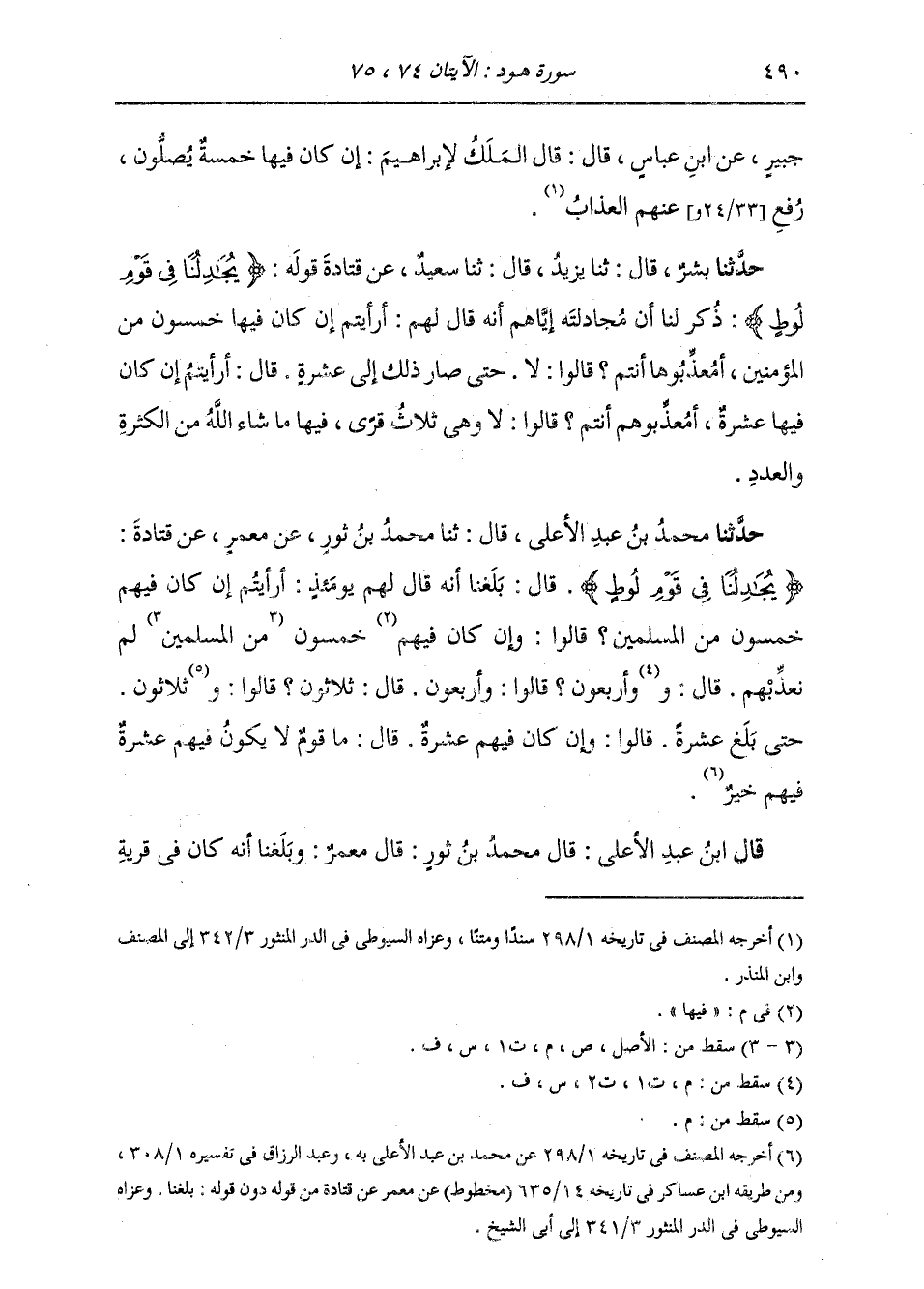 حَدَّثَنَا مُحَمَّدُ بْنُ عَبْدِ الْأَعْلَى، قَالَ: ثَنَا مُحَمَّدُ بْنُ ثَوْرٍ، عَنْ مَعْمَرٍ، عَنْ قَتَادَةَ: " {§يُجَادِلُنَا فِي قَوْمِ لُوطٍ} [هود: 74] قَالَ: بَلَغَنَا أَنَّهُ قَالَ لَهُمْ يَوْمَئِذٍ: أَرَأَيْتُمْ إِنْ كَانَ فِيهَا خَمْسُونَ مِنَ الْمُسْلِمِينَ؟ قَالُوا: إِنْ كَانَ فِيهَا خَمْسُونَ لَمْ نُعَذِّبْهُمْ، قَالَ: أَرْبَعُونَ؟ قَالُوا: وَأَرْبَعُونَ. قَالَ: ثَلَاثُونَ؟ قَالُوا: ثَلَاثُونَ. حَتَّى بَلَغَ عَشَرَةً، قَالُوا: وَإِنْ كَانَ فِيهِمْ عَشَرَةٌ، قَالَ: مَا قَوْمٌ لَا يَكُونُ فِيهِمْ عَشَرَةٌ فِيهِمْ خَيْرٌ. قَالَ ابْنُ عَبْدِ الْأَعْلَى، قَالَ مُحَمَّدُ بْنُ ثَوْرٍ: قَالَ مَعْمَرٌ: بَلَغَنَا أَنَّهُ كَانَ فِي قَرْيَةِ -[491]- لُوطٍ أَرْبَعَةُ آلَافِ أَلْفِ إِنْسَانٍ، أَوْ مَا شَاءَ اللَّهُ مِنْ ذَلِكَ "
