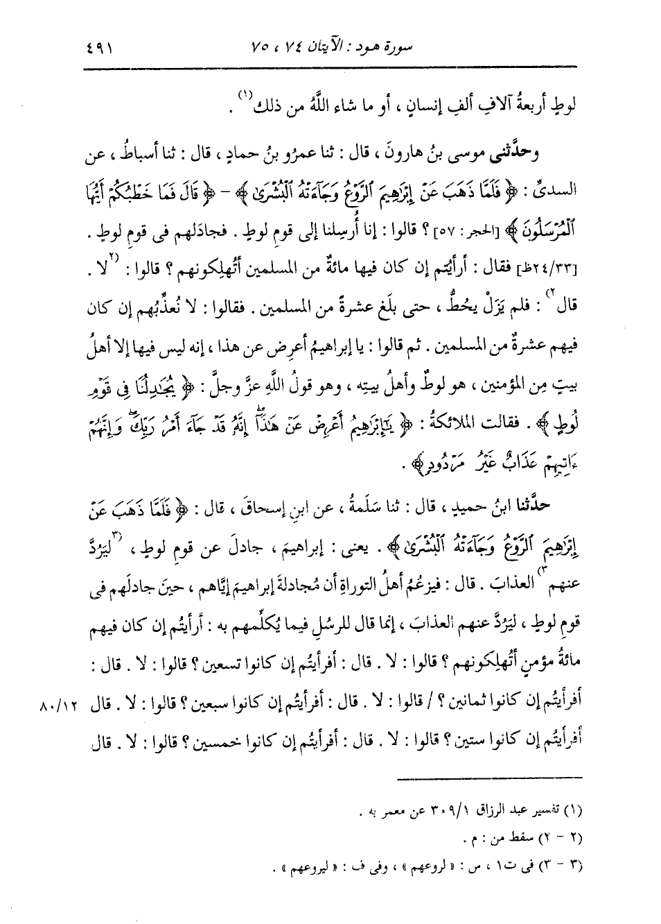 حَدَّثَنِي مُوسَى بْنُ هَارُونَ، قَالَ: ثَنَا عَمْرُو بْنُ حَمَّادٍ، قَالَ: ثَنَا أَسْبَاطٌ، عَنِ السُّدِّيِّ، " {§فَلَمَّا ذَهَبَ عَنْ إِبْرَاهِيمَ الرَّوْعُ، وَجَاءَتْهُ الْبُشْرَى} [هود: 74] {قَالَ فَمَا خَطْبُكُمْ أَيُّهَا الْمُرْسَلُونَ} [الحجر: 57] قَالُوا: إِنَّا أُرْسِلْنَا إِلَى قَوْمِ لُوطٍ فَجَادَلَهُمْ فِي قَوْمِ لُوطٍ، قَالَ: أَرَأَيْتُمْ إِنْ كَانَ فِيهَا مِائَةٌ مِنَ الْمُسْلِمِينَ أَتُهْلِكُونَهُمْ؟ قَالُوا: لَا، فَلَمْ يَزَلْ يَحُطُّ حَتَّى بَلَغَ عَشَرَةً مِنَ الْمُسْلِمِينَ، فَقَالُوا: لَا نُعَذِّبُهُمْ إِنْ كَانَ فِيهِمْ عَشَرَةٌ مِنَ الْمُسْلِمِينَ. ثُمَّ قَالُوا: {يَا إِبْرَاهِيمُ أَعْرِضْ عَنْ هَذَا} [هود: 76] إِنَّهُ لَيْسَ فِيهَا إِلَّا أَهْلُ بَيْتٍ مِنَ الْمُؤْمِنِينَ هُوَ لُوطٌ وَأَهْلُ بَيْتِهِ، وَهُوَ قَوْلُ اللَّهِ تَعَالَى ذِكْرُهُ: {يُجَادِلُنَا فِي قَوْمِ لُوطٍ} [هود: 74] فَقَالَتِ الْمَلَائِكَةُ: {يَا إِبْرَاهِيمُ أَعْرِضْ عَنْ هَذَا إِنَّهُ قَدْ جَاءَ أَمْرُ رَبِّكَ وَإِنَّهُمْ آتِيهِمْ عَذَابٌ غَيْرُ مَرْدُودٍ} [هود: 76] "