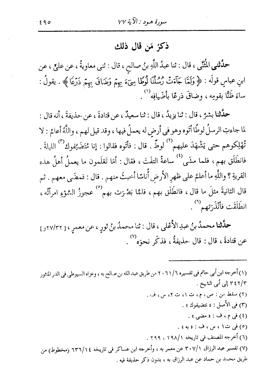 حَدَّثَنَا بِشْرٌ، قَالَ: ثَنَا يَزِيدُ، قَالَ: ثَنَا سَعِيدٌ، عَنْ قَتَادَةَ، عَنْ حُذَيْفَةَ، أَنَّهُ قَالَ: " §لَمَّا جَاءَتِ الرُّسُلُ لُوطًا أَتَوْهُ وَهُوَ فِي أَرْضٍ لَهُ يَعْمَلُ فِيهَا، وَقَدْ قِيلَ لَهُمْ وَاللَّهُ أَعْلَمُ: لَا تُهْلِكُوهُمْ حَتَّى يَشْهَدَ لُوطٌ قَالَ: فَأَتَوْهُ فَقَالُوا: إِنَّا مُتَضَيِّفُوكَ اللَّيْلَةَ فَانْطَلَقَ بِهِمْ، فَلَمَّا مَضَى سَاعَةً الْتَفَتَ، فَقَالَ: أَمَا تَعْلَمُونَ مَا يَعْمَلُ أَهْلُ هَذِهِ الْقَرْيَةِ؟ وَاللَّهِ مَا أَعْلَمُ عَلَى ظَهْرِ الْأَرْضِ أُنَاسًا أَخْبَثَ مِنْهُمْ قَالَ: فَمَضَى مَعَهُمْ، ثُمَّ قَالَ الثَّانِيَةَ مِثْلَ مَا قَالَ، فَانْطَلَقَ بِهِمْ، فَلَمَّا بَصُرَتْ بِهِمْ عَجُوزُ السُّوءِ امْرَأَتُهُ، انْطَلَقَتْ فَأَنْذَرَتْهُمْ " حَدَّثَنَا مُحَمَّدُ بْنُ عَبْدِ الْأَعْلَى، قَالَ: ثَنَا مُحَمَّدُ بْنُ ثَوْرٍ، عَنْ مَعْمَرٍ، عَنْ قَتَادَةَ، قَالَ: قَالَ حُذَيْفَةُ، فَذَكَرَ نَحْوَهُ