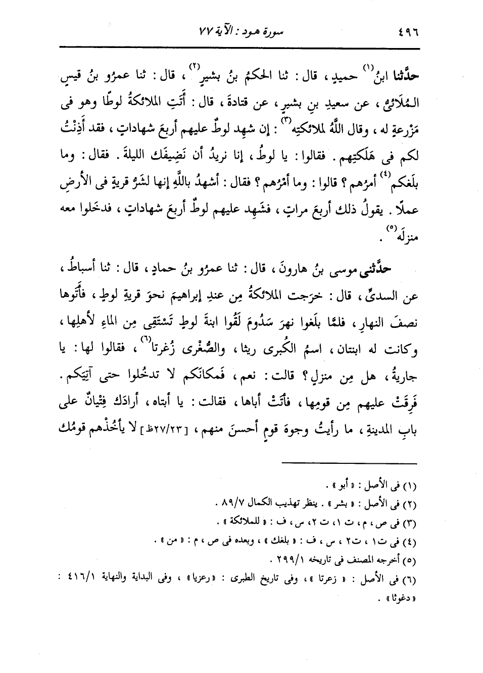حَدَّثَنَا ابْنُ حُمَيْدٍ، قَالَ: ثَنَا الْحَكَمُ بْنُ بَشِيرٍ، قَالَ: ثَنَا عَمْرُو بْنُ قَيْسٍ الْمُلَائِيُّ، عَنْ سَعِيدِ بْنِ بَشِيرٍ، عَنْ قَتَادَةَ، قَالَ: " §أَتَتِ الْمَلَائِكَةُ لُوطًا وَهُوَ فِي مَزْرَعَةٍ لَهُ، وَقَالَ اللَّهُ لِلْمَلَائِكَةِ: إِنْ شَهِدَ لُوطٌ عَلَيْهِمْ أَرْبَعَ شَهَادَاتٍ، فَقَدْ أَذِنْتُ لَكُمْ فِي هَلَكَتِهِمْ، فَقَالُوا: يَا لُوطُ إِنَّا نُرِيدُ أَنْ نُضَيِّفَكَ اللَّيْلَةَ، فَقَالَ: وَمَا بَلَغَكُمْ مِنْ أَمْرِهِمْ؟ قَالُوا: وَمَا أَمْرُهُمْ؟ قَالَ: أَشْهَدُ بِاللَّهِ إِنَّهَا لَشَرُّ قَرْيَةٍ فِي الْأَرْضِ عَمَلًا يَقُولُ ذَلِكَ أَرْبَعَ مَرَّاتٍ. فَشَهِدَ عَلَيْهِمْ لُوطٌ أَرْبَعَ شَهَادَاتٍ، فَدَخَلُوا مَعَهُ مَنْزِلَهُ "