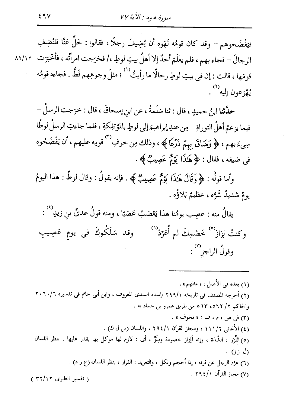 حَدَّثَنَا ابْنُ حُمَيْدٍ، قَالَ: ثَنَا سَلَمَةُ، عَنِ ابْنِ إِسْحَاقَ، قَالَ: " §خَرَجَتِ الرُّسُلُ فِيمَا يَزْعُمُ أَهْلُ التَّوْرَاةِ مِنْ عِنْدِ إِبْرَاهِيمَ إِلَى لُوطٍ بِالْمُؤْتَفِكَةِ، فَلَمَّا جَاءَتِ الرُّسُلُ لُوطًا {سِيءَ بِهِمْ وَضَاقَ بِهِمْ ذَرْعًا} [هود: 77] وَذَلِكَ مِنْ تَخَوُّفِ قَوْمِهِ عَلَيْهِمْ أَنْ يَفْضَحُوهُ فِي ضَيْفِهِ، فَقَالَ: {هَذَا يَوْمٌ عَصِيبٌ} [هود: 77] " وَأَمَّا قَوْلُهُ: {وَقَالَ هَذَا يَوْمٌ عَصِيبٌ} [هود: 77] فَإِنَّهُ يَقُولُ: وَقَالَ لُوطٌ: هَذَا الْيَوْمُ يَوْمٌ شَدِيدٌ شَرُّهُ، عَظِيمٌ بَلَاؤُهُ، يُقَالُ مِنْهُ: عَصَبَ يَوْمُنَا هَذَا يَعْصِبُ عَصْبًا، وَمِنْهُ قَوْلُ عَدِيِّ بْنِ زَيْدٍ: