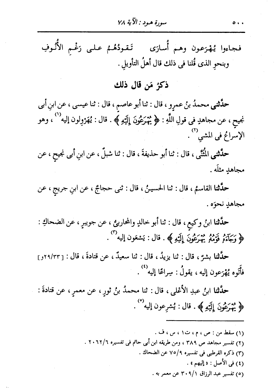 حَدَّثَنِي مُحَمَّدُ بْنُ عَمْرٍو، قَالَ: ثَنَا أَبُو عَاصِمٍ، قَالَ: ثَنَا عِيسَى، عَنِ ابْنِ أَبِي نَجِيحٍ، عَنْ مُجَاهِدٍ، فِي قَوْلِ اللَّهِ: " {§يُهْرَعُونَ إِلَيْهِ} [هود: 78] قَالَ: يُهْرَعُونَ، وَهُوَ الْإِسْرَاعُ فِي الْمَشْي " حَدَّثَنِي الْمُثَنَّى، قَالَ: ثَنَا أَبُو حُذَيْفَةَ، قَالَ: ثَنَا شِبْلٌ، عَنِ ابْنِ أَبِي نَجِيحٍ، عَنْ مُجَاهِدٍ، مِثْلَهُ حَدَّثَنَا الْقَاسِمُ، قَالَ: ثَنَا الْحُسَيْنُ، قَالَ: ثَنِي حَجَّاجٌ، عَنِ ابْنِ جُرَيْجٍ، عَنْ مُجَاهِدٍ، نَحْوَهُ