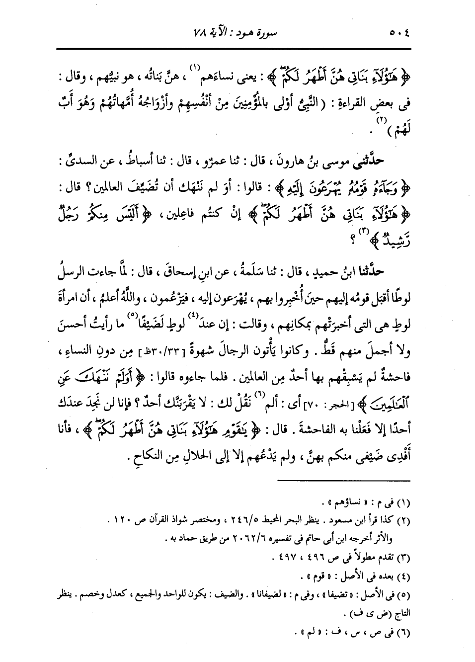 حَدَّثَنِي مُوسَى بْنُ هَارُونَ، قَالَ: ثَنَا عَمْرٌو، قَالَ: ثَنَا أَسْبَاطٌ، عَنِ السُّدِّيِّ، " {§وَجَاءَهُ قَوْمُهُ يُهْرَعُونَ إِِلَيْهِ} [هود: 78] قَالُوا: أَوَ لَمْ نَنْهَكَ أَنْ تُضَيِّفَ الْعَالَمِينَ، قَالَ: {هَؤُلَاءِ بَنَاتِي هُنَّ أَطْهَرُ لَكُمْ} [هود: 78] إِنْ كُنْتُمْ فَاعِلِينَ {أَلَيْسَ مِنْكُمْ رَجُلٌ رُشَيْدٌ} [هود: 78] "