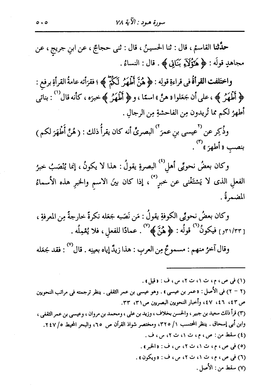 حَدَّثَنَا الْقَاسِمُ، قَالَ: ثَنَا الْحُسَيْنُ، قَالَ: ثَنِي حَجَّاجٌ، عَنِ ابْنِ جُرَيْجٍ، عَنْ مُجَاهِدٍ، قَوْلُهُ: " {§هَؤُلَاءِ بَنَاتِي} [هود: 78] قَالَ: النِّسَاءُ " وَاخْتَلَفَتِ الْقُرَّاءُ فِي قِرَاءَةِ قَوْلِهِ: {هُنَّ أَطْهَرُ لَكُمْ} [هود: 78] فَقَرَأَتْهُ عَامَّةُ الْقُرَّاءِ بِرَفْعِ أَطْهَرُ، عَلَى أَنْ جَعَلُوا «هُنَّ» اسْمًا، «وَأَطْهَرُ» خَبَرُهُ، كَأَنَّهُ قِيلَ: بَنَاتِي أَطْهُرُ لَكُمْ مِمَّا تُرِيدُونَ مِنَ الْفَاحِشَةِ مِنَ الرِّجَالِ. وَذُكِرَ عَنْ عِيسَى بْنِ عُمَرَ الْبَصْرِيِّ أَنَّهُ كَانَ يَقْرَأُ ذَلِكَ: «هُنَّ أَطْهُرَ» لَكُمْ بِنَصْبِ «أَطْهُرَ» . وَكَانَ بَعْضُ نَحْوِيِّي الْبَصْرَةِ يَقُولُ. هَذَا لَا يَكُونُ، إِنَّمَا يُنْصَبُ خَبَرُ الْفِعْلِ الَّذِي لَا يَسْتَغْنِي عَنِ الْخَبَرِ إِذَا كَانَ بَيْنَ الِاسْمِ وَالْخَبَرِ هَذِهِ الْأَسْمَاءُ الْمُضَمَّرَةُ. وَكَانَ بَعْضُ نَحْوِيِّي الْكُوفَةِ يَقُولُ: مَنْ نَصَبَهُ جَعَلَهُ نَكِرَةً خَارِجَةً مِنَ الْمَعْرِفَةِ، وَيَكُونُ قَوْلُهُ: «هُنَّ» عِمَادًا لِلْفِعْلِ فَلَا يَعْمَلُهُ. وَقَالَ آخِرُ مِنْهُمْ: مَسْمُوعٌ مِنَ الْعَرَبِ: هَذَا زَيْدٌ إِيَّاهُ بِعَيْنِهِ، قَالَ: فَقَدْ جَعَلَهُ
