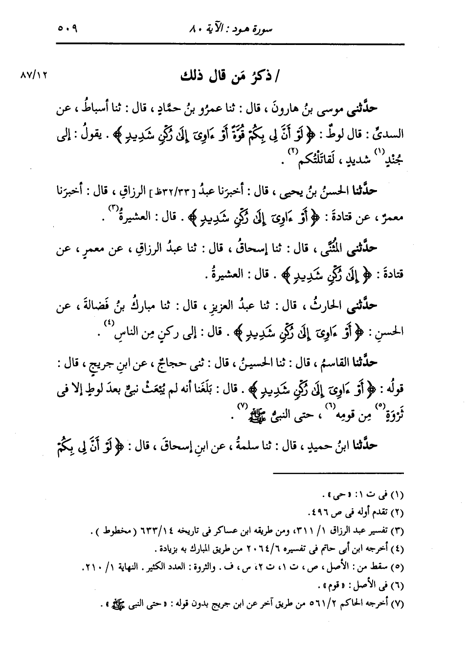 حَدَّثَنَا ابْنُ حُمَيْدٍ، قَالَ: ثَنَا سَلَمَةُ، عَنِ ابْنِ إِسْحَاقَ، قَالَ: " {§لَوْ أَنَّ لِي بِكُمْ -[510]- قُوَّةً أَوْ آوِي إِلَى رُكْنٍ شَدِيدٍ} [هود: 80] أَيْ عَشِيرَةٍ تَمْنَعُنِي أَوْ شِيعَةٍ تَنْصُرُنِي، لَحُلْتُ بَيْنَكُمْ وَبَيْنَ هَذَا "