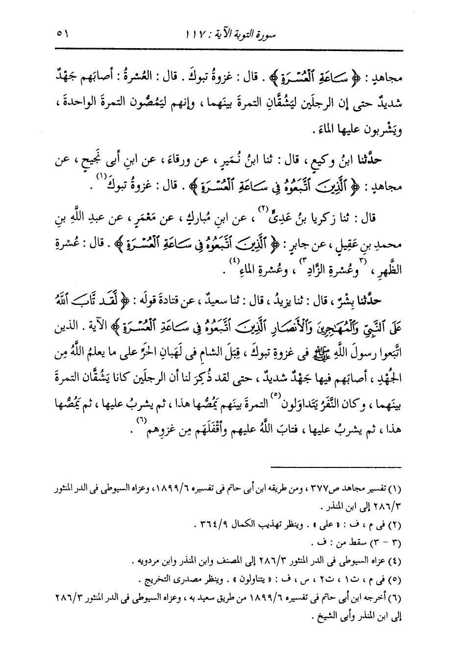 حَدَّثَنَا ابْنُ وَكِيعٍ، قَالَ: ثَنَا ابْنُ نُمَيْرٍ، عَنْ وَرْقَاءَ، عَنِ ابْنِ أَبِي نَجِيحٍ، عَنْ مُجَاهِدٍ: " {§الَّذِينَ اتَّبَعُوهُ فِي سَاعَةِ الْعُسْرَةِ} [التوبة: 117] قَالَ: غَزْوَةُ تَبُوكَ "