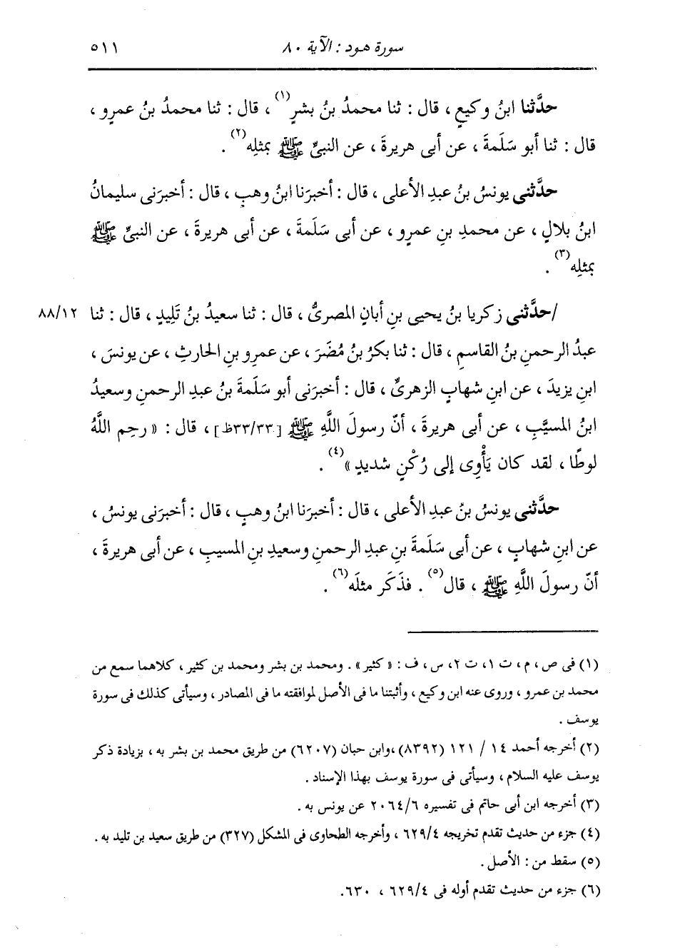 حَدَّثَنِي زَكَرِيَّا بْنُ يَحْيَى بْنِ أَبَانَ الْمِصْرِيُّ، قَالَ: ثَنَا سَعِيدُ بْنُ تَلِيدٍ، قَالَ: ثَنَا عَبْدُ الرَّحْمَنِ بْنُ الْقَاسِمِ، قَالَ: ثَنِي بَكْرُ بْنُ مُضَرَ، عَنْ عَمْرِو بْنِ الْحَارِثِ، عَنْ يُونُسَ بْنِ يَزِيدَ، عَنِ ابْنِ شِهَابٍ الزُّهْرِيِّ، قَالَ: أَخْبَرَنِي أَبُو سَلَمَةَ بْنُ عَبْدِ الرَّحْمَنِ وَسَعِيدُ بْنُ الْمُسَيِّبِ، عَنْ أَبِي هُرَيْرَةَ أَنَّ رَسُولَ اللَّهِ صَلَّى اللهُ عَلَيْهِ وَسَلَّمَ قَالَ: «§رَحِمَ اللَّهُ لُوطًا، لَقَدْ كَانَ يَأْوِي إِلَى رُكْنٍ شَدِيدٍ» حَدَّثَنِي يُونُسُ بْنُ عَبْدِ الْأَعْلَى، قَالَ: أَخْبَرَنَا ابْنُ وَهْبٍ، قَالَ: أَخْبَرَنِي يُونُسُ، عَنِ ابْنِ شِهَابٍ، عَنْ أَبِي سَلَمَةَ بْنِ عَبْدِ الرَّحْمَنِ، وَسَعِيدِ بْنِ الْمُسَيِّبِ، عَنْ أَبِي هُرَيْرَةَ أَنَّ رَسُولَ اللَّهِ صَلَّى اللهُ عَلَيْهِ وَسَلَّمَ، قَالَ: فَذَكَرَ مِثْلَهُ