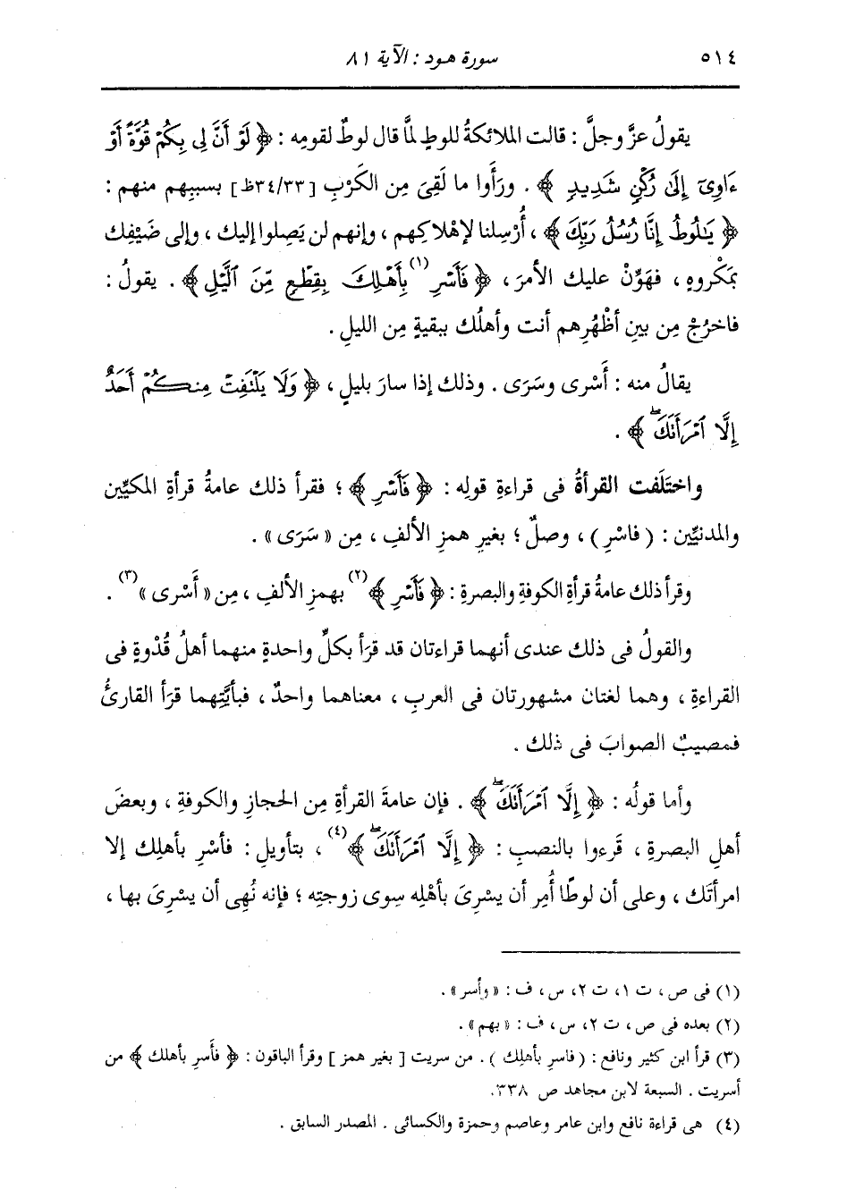 يَقُولُ تَعَالَى ذِكْرُهُ: قَالَتِ الْمَلَائِكَةُ لِلُوطٍ لَمَّا قَالَ لُوطٌ لِقَوْمِهِ {لَوْ أَنَّ لِي بِكُمْ قُوَّةً أَوْ آوِي إِلَى رُكْنٍ شَدِيدٍ} [هود: 80] وَرَأَوْا مَا لَقِيَ مِنَ الْكَرْبِ بِسَبَبِهِمْ مِنْهُمْ: {يَا لُوطُ إِنَّا رُسُلُ رَبِّكَ} [هود: 81] أُرْسِلْنَا لِإِهْلَاكِهِمْ، وَإِنَّهُمْ لَنْ يَصِلُوا إِلَيْكَ، وَإِلَى ضَيْفِكَ بِمَكْرُوهٍ، فَهَوِّنْ عَلَيْكَ الْأَمْرَ، {فَأَسْرِ بِأَهْلِكَ بِقِطْعٍ مِنَ اللَّيْلِ} [هود: 81] يَقُولُ: فَاخْرُجْ مِنْ بَيْنِ أَظْهُرِهِمْ أَنْتَ وَأَهْلُكَ بِبَقِيَّةٍ مِنَ اللَّيْلِ، يُقَالُ مِنْهُ: أَسْرَى وَسَرَى، وَذَلِكَ إِذَا سَارَ بِلَيْلٍ. {وَلَا يَلْتَفِتُ مِنْكُمْ أَحَدٌ إِلَّا امْرَأَتَكَ} [هود: 81] وَاخْتَلَفَتِ الْقُرَّاءُ فِي قِرَاءَةِ قَوْلِهِ: {فَأَسْرِ} [هود: 81] فَقَرَأَ ذَلِكَ عَامَّةُ قُرَّاءِ الْمَكِّيِّينَ وَالْمَدَنِيِّينَ: «فَاسْرِ» وَصْلٌ بِغَيْرِ هَمْزِ الْأَلِفِ مِنْ «سَرَى» . وَقَرَأَ ذَلِكَ عَامَّةُ قُرَّاءِ الْكُوفَةِ وَالْبَصْرَةِ: {فَأَسْرِ} [هود: 81] بِهَمْزِ الْأَلِفِ مِنْ «أَسْرَى» وَالْقَوْلُ عِنْدِي فِي ذَلِكَ أَنَّهُمَا قِرَاءَتَانِ قَدْ قَرَأَ بِكُلِّ وَاحِدَةٍ مِنْهُمَا أَهْلُ قُدْوَةٍ فِي الْقِرَاءَةِ، وَهُمَا لُغَتَانِ مَشْهُورَتَانِ فِي الْعَرَبِ مَعْنَاهُمَا وَاحِدٌ، فَبِأَيَّتِهِمَا قَرَأَ الْقَارِئُ فَمُصِيبٌ الصَّوَابَ فِي ذَلِكَ. وَأَمَّا قَوْلُهُ: {إِلَّا امْرَأَتَكَ} [هود: 81] فَإِنَّ عَامَّةَ الْقُرَّاءِ مِنَ الْحِجَازِ وَالْكُوفَةِ، وَبَعْضِ أَهْلِ الْبَصْرَةِ، قَرَءُوا بِالنَّصْبِ {إِلَّا امْرَأَتَكَ} [هود: 81] بِتَأْوِيلِ: فَأَسْرِ بِأَهْلِكَ إِلَّا امْرَأَتَكَ، وَعَلَى أَنَّ لُوطًا أُمِرَ أَنْ يَسْرِيَ بِأَهْلِهِ سِوَى زَوْجَتِهِ، فَإِنَّهُ نُهِيَ أَنْ يَسْرِيَ بِهَا،