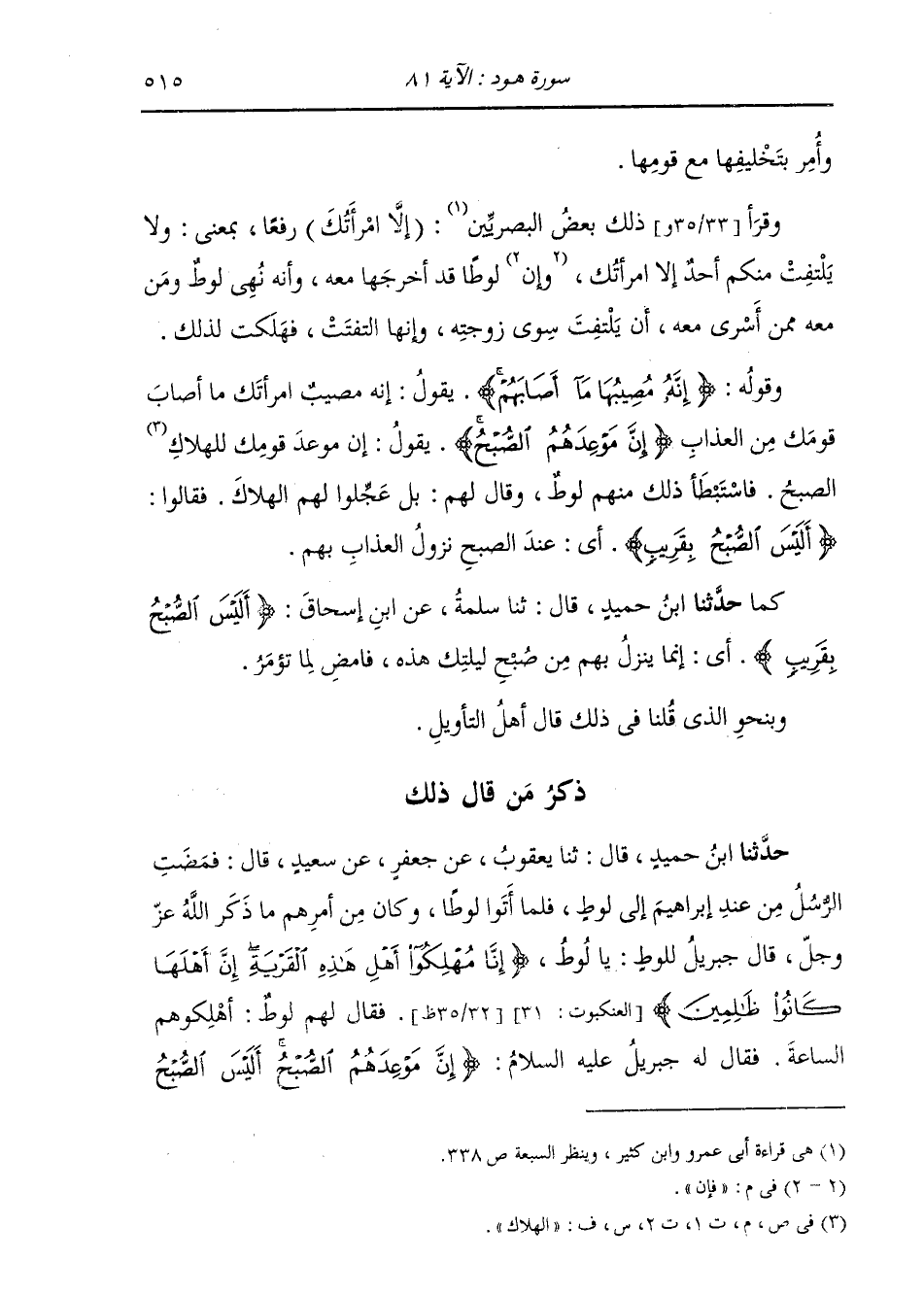 وَأَمَرَ بِتَخْلِيفِهَا مَعَ قَوْمِهَا. وَقَرَأَ ذَلِكَ بَعْضُ الْبَصْرِيِّينَ: «إِلَّا امْرَأَتُكَ» رَفْعًا، بِمَعْنَى: وَلَا يَلْتَفِتُ مِنْكُمْ أَحَدٌ إِلَّا امْرَأَتُكَ، فَإِنَّ لُوطًا قَدْ أَخْرَجَهَا مَعَهُ، وَإِنَّهُ نُهِيَ لُوطٌ وَمَنْ مَعَهُ مِمَّنْ أَسْرَى مَعَهُ أَنْ يَلْتَفِتَ سِوَى زَوْجَتِهِ، وَأَنَّهَا الْتَفَتَتْ فَهَلَكَتْ لِذَلِكَ. وَقَوْلُهُ: {إِنَّهُ مُصِيبُهَا مَا أَصَابَهُمْ} [هود: 81] يَقُولُ: إِنَّهُ مُصِيبُ امْرَأَتِكَ مَا أَصَابَ قَوْمُكَ مِنَ الْعَذَابِ. {إِنَّ مَوْعِدَهُمُ الصُّبْحُ} [هود: 81] يَقُولُ: إِنَّ مَوْعِدَ قَوْمِكَ الْهَلَاكُ الصُّبْحَ. فَاسْتَبْطَأَ ذَلِكَ مِنْهُمْ لُوطٌ، وَقَالَ لَهُمْ: بَلَى عَجِّلُوا لَهُمُ الْهَلَاكَ فَقَالُوا: {أَلَيْسَ الصُّبْحُ بِقَرِيبٍ} [هود: 81] أَيْ عِنْدَ الصُّبْحِ نُزُولُ الْعَذَابِ بِهِمْ. كَمَا