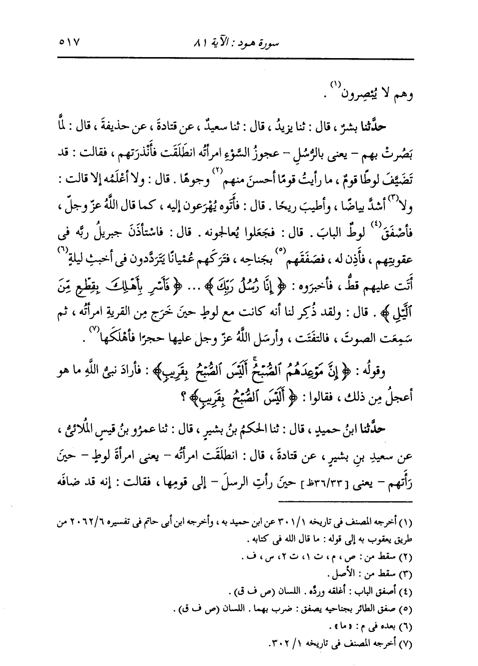 حَدَّثَنَا بِشْرٌ، قَالَ: ثَنَا يَزِيدُ، قَالَ: ثَنَا سَعِيدٌ، عَنْ قَتَادَةَ، عَنْ حُذَيْفَةَ، قَالَ: " §لَمَّا بَصُرَتْ بِهِمْ، يَعْنِي بِالرُّسُلِ، عَجُوزُ السُّوءِ امْرَأَتُهُ، انْطَلَقَتْ فَأَنْذَرَتْهُمْ فَقَالَتْ: إِنَّهُ تَضَيَّفَ لُوطًا قَوْمٌ مَا رَأَيْتُ قَوْمًا أَحْسَنَ وجُوهًا قَالَ: وَلَا أَعْلَمُهُ إِلَّا قَالَتْ: وَلَا أَشَدَّ بَيَاضًا، وَأَطْيَبَ رِيحًا، قَالَ: فَأَتَوْهُ يُهْرَعُونَ إِلَيْهِ، كَمَا قَالَ اللَّهُ، فَأَصْفَقَ لُوطٌ الْبَابَ، قَالَ: فَجَعَلُوا يُعَالِجُونَهُ، قَالَ: فَاسْتَأْذَنَ جَبْرَئِيلُ رَبَّهُ فِي عُقُوبَتِهِمْ، فَأَذِنَ لَهُ، فَصَفَقَهُمْ بِجَنَاحِهِ، فَتَرَكَهُمْ عُمْيَانًا يَتَرَدَّدُونَ فِي أَخْبَثُ لَيْلَةٍ مَا أَتَتْ عَلَيْهِمْ قَطُّ، فَأَخْبَرُوهُ {إِنَّا رُسُلُ رَبِّكَ} [هود: 81] {فَأَسِرْ بِأَهْلِكَ بِقِطْعٍ مِنَ اللَّيْلِ} [هود: 81] قَالَ: وَلَقَدْ ذُكِرَ لَنَا أَنَّهُ كَانَتْ مَعَ لُوطٍ حِينَ خَرَجَ مِنَ الْقَرْيَةِ امْرَأَتُهُ، ثُمَّ سَمِعْتِ الصَّوْتَ، فَالْتَفَتَتْ وَأَرْسَلَ اللَّهُ عَلَيْهَا حَجَرًا فَأَهْلَكَهَا. وَقَوْلُهُ: {إِنَّ مَوْعِدَهُمُ الصُّبْحُ أَلَيْسَ الصُّبْحُ بِقَرِيبٍ} [هود: 81] فَأَرَادَ نَبِيُّ اللَّهِ مَا هُوَ أَعْجَلُ مِنْ ذَلِكَ، فَقَالُوا أَلَيْسَ الصُّبْحُ بِقَرِيبٍ "
