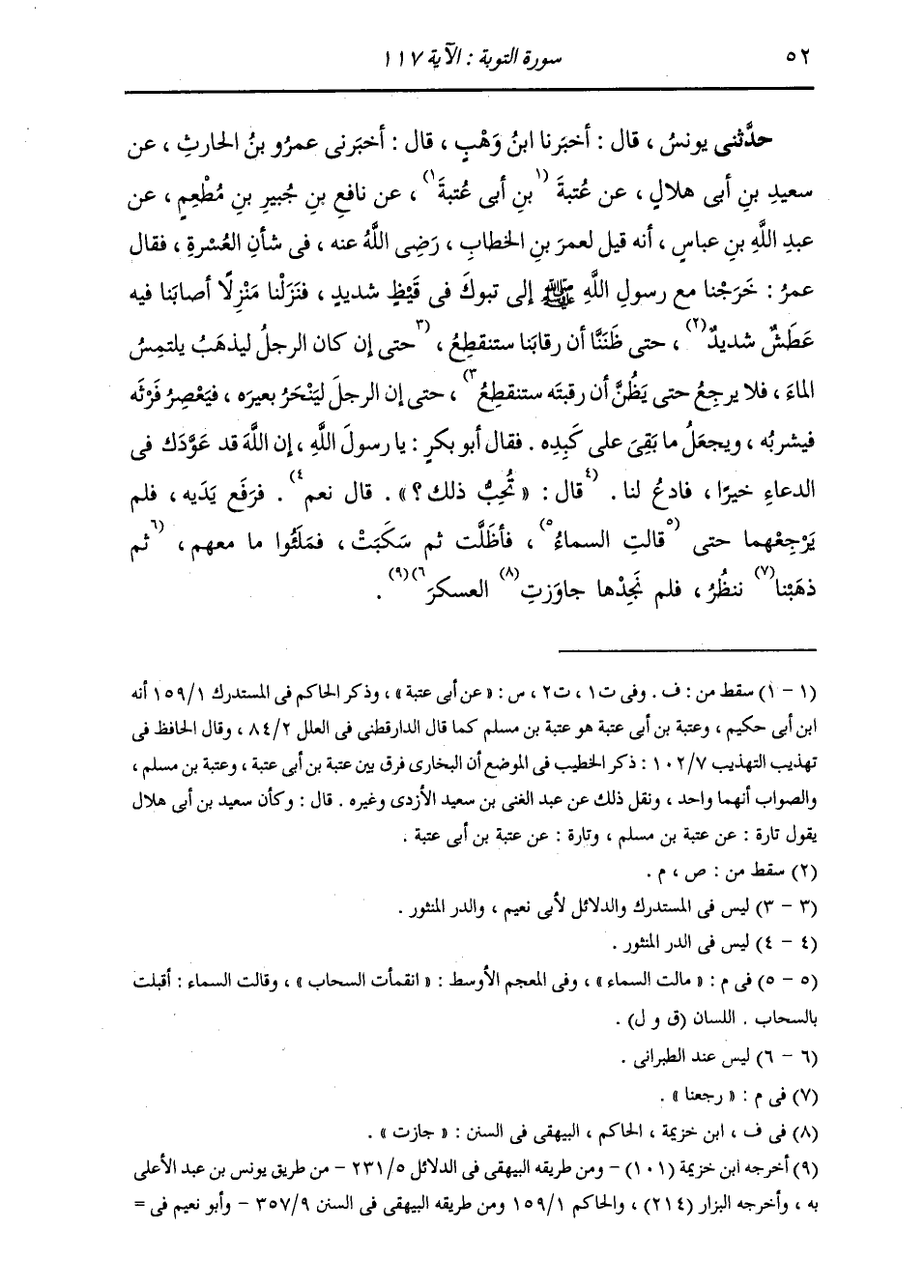 حَدَّثَنِي يُونُسُ، قَالَ: أَخْبَرَنَا ابْنُ وَهْبٍ، قَالَ: أَخْبَرَنِي عَمْرُو بْنُ الْحَارِثِ، عَنْ سَعِيدِ بْنِ أَبِي هِلَالٍ، عَنْ عُتْبَةَ بْنِ أَبِي عُتْبَةَ، عَنْ نَافِعِ بْنِ جُبَيْرِ بْنِ مُطْعِمٍ، عَنْ عَبْدِ اللَّهِ بْنِ عَبَّاسٍ، أَنَّهُ قِيلَ لِعُمَرَ بْنَ الْخَطَّابِ رَحْمَةُ اللَّهِ عَلَيْهِ فِي شَأْنِ الْعُسْرَةِ، فَقَالَ عُمَرُ: " §خَرَجْنَا مَعَ رَسُولِ اللَّهِ صَلَّى اللهُ عَلَيْهِ وَسَلَّمَ إِلَى تَبُوكَ فِي قَيْظٍ شَدِيدٍ، فَنَزَلْنَا مَنْزِلًا أَصَابَنَا فِيهِ عَطَشٌ، حَتَّى ظَنَنَّا أَنَّ رِقَابَنَا سَتَنْقَطِعُ، حَتَّى أَنْ كَانَ الرَّجُلُ لَيَذْهَبُ يَلْتَمِسُ الْمَاءَ فَلَا يَرْجِعُ حَتَّى يَظُنُّ أَنَّ رَقَبَتَهُ سَتَنْقَطِعُ، حَتَّى إِنَّ الرَّجُلَ لَيَنْحَرُ بَعِيرَهُ فَيَعْصِرُ فَرْثَهُ فَيَشْرَبُهُ، وَيَجْعَلُ مَا بَقِيَ عَلَى كَبِدِهِ؛ فَقَالَ أَبُو بَكْرٍ: يَا رَسُولَ اللَّهِ إِنَّ اللَّهَ قَدْ عَوَّدَكَ فِي الدُّعَاءِ خَيْرًا، فَادْعُ لَنَا قَالَ: «تُحِبُّ ذَلِكَ؟» قَالَ: نَعَمْ. فَرَفَعَ يَدَيْهِ فَلَمْ يُرْجِعْهُمَا حَتَّى مَالَتِ السَّمَاءُ، فَأَظَلَّتْ ثُمَّ سَكَبَتْ، فَمَلَئُوا مَا مَعَهُمْ، ثُمَّ رَجَعْنَا نَنْظُرُ فَلَمْ نَجِدْهَا جَاوَزْتِ الْعَسْكَرَ " -[53]- حَدَّثَنِي إِسْحَاقُ بْنُ زِيَادٍ الْعَطَّارُ، قَالَ: ثَنَا يَعْقُوبُ بْنُ مُحَمَّدٍ، قَالَ: ثَنَا عَبْدُ اللَّهِ بْنُ وَهْبٍ، قَالَ: ثَنَا عَمْرُو بْنُ الْحَارِثِ، عَنْ سَعِيدِ بْنِ أَبِي هِلَالٍ، عَنْ نَافِعِ بْنِ جُبَيْرٍ، عَنِ ابْنِ عَبَّاسٍ قَالَ: قِيلَ لِعُمَرَ بْنِ الْخَطَّابِ رَحْمَةُ اللَّهِ عَلَيْهِ: حَدَّثَنَا عَنْ شَأْنِ جَيْشِ الْعُسْرَةِ، فَقَالَ عُمَرُ: خَرَجْنَا مَعَ رَسُولِ اللَّهِ صَلَّى اللهُ عَلَيْهِ وَسَلَّمَ، ثُمَّ ذَكَرَ نَحْوَهُ