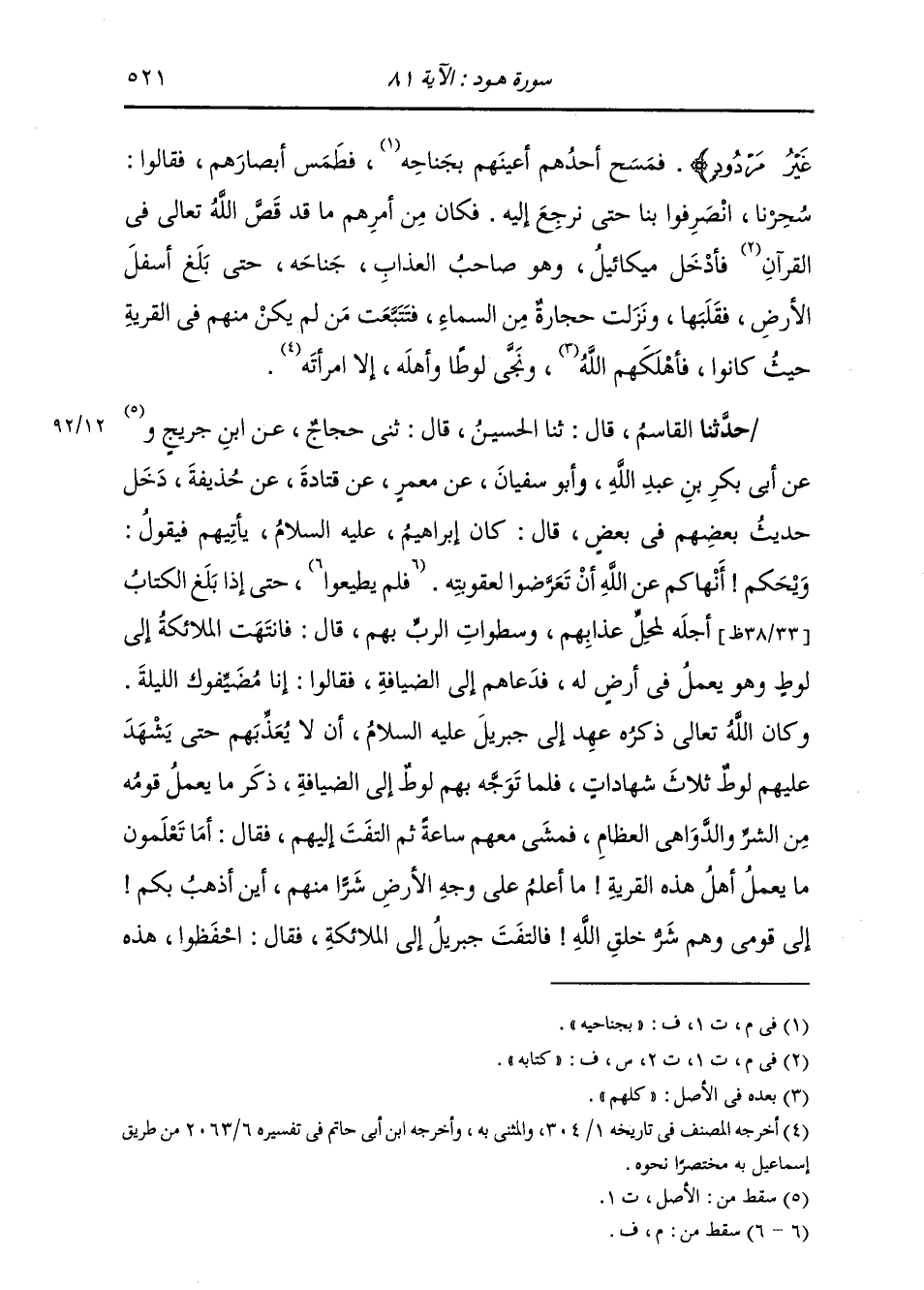 حَدَّثَنَا الْقَاسِمُ، قَالَ: ثَنَا الْحُسَيْنُ، قَالَ: ثَنِي حَجَّاجٌ، عَنِ ابْنِ جُرَيْجٍ، وعَنْ أَبِي بَكْرِ بْنِ عَبْدِ اللَّهِ وَأَبُو سُفْيَانَ، عَنْ مَعْمَرٍ، عَنْ قَتَادَةَ، عَنْ حُذَيْفَةَ: " §دَخَلَ حَدِيثُ بَعْضِهِمْ فِي بَعْضٍ، قَالَ: كَانَ إِبْرَاهِيمُ عَلَيْهِ السَّلَامُ يَأْتِيهِمْ فَيَقُولُ: وَيْحَكُمْ أَنْهَاكُمْ عَنِ اللَّهِ أَنْ تَعَرَّضُوا لِعُقُوبَتِهِ، حَتَّى إِذَا بَلَغَ الْكِتَابُ أَجَلَهُ لِمَحِلِّ عَذَابِهِمْ، وَسَطَوَاتِ الرَّبِّ بِهِمْ، قَالَ: فَانْتَهَتِ الْمَلَائِكَةُ إِلَى لُوطٍ، وَهُوَ يَعْمَلُ فِي أَرْضٍ لَهُ، فَدَعَاهُمْ إِلَى الضِّيَافَةِ، فَقَالُوا: إِنَّا مُضَيِّفُوكَ اللَّيْلَةَ. وَكَانَ اللَّهُ تَعَالَى عَهِدَ إِلَى جِبْرِيلَ عَلَيْهِ السَّلَامُ أَنْ لَا تُعَذِّبَهُمْ حَتَّى يَشْهَدَ عَلَيْهِمْ لُوطٌ ثَلَاثَ شَهَادَاتٍ؛ فَلَمَّا تَوَجَّهَ بِهِمْ لُوطٌ إِلَى الضِّيَافَةِ، ذَكَرَ مَا يَعْمَلُ قَوْمُهُ مِنَ الشَّرِّ، وَالدَّوَاهِي الْعِظَامِ، فَمَشَى مَعَهُمْ سَاعَةً، ثُمَّ الْتَفَتَ إِلَيْهِمْ، فَقَالَ: أَمَا تَعْلَمُونَ مَا يَعْمَلُ أَهْلُ هَذِهِ الْقَرْيَةِ؟ مَا أَعْلَمُ عَلَى وَجْهِ الْأَرْضِ شَرًّا مِنْهُمْ، أَيْنَ أَذْهَبُ بِكُمْ؟ إِلَى قَوْمِي، وَهُمْ شَرُّ خَلْقِ اللَّهِ فَالْتَفَتَ جَبْرَئِيلُ إِلَى الْمَلَائِكَةِ فَقَالَ: احْفَظُوا هَذِهِ -[522]- وَاحِدَةً ثُمَّ مَشَى سَاعَةً؛ فَلَمَّا تَوَسَّطَ الْقَرْيَةَ، وَأَشْفَقَ عَلَيْهِمْ وَاسْتَحْيَا مِنْهُمْ، قَالَ: أَمَا تَعْلَمُونَ مَا يَعْمَلُ أَهْلُ هَذِهِ الْقَرْيَةِ؟ وَمَا أَعْلَمُ عَلَى وَجْهِ الْأَرْضِ شَرًّا مِنْهُمْ، إِنَّ قَوْمِي شَرُّ خَلْقِ اللَّهِ فَالْتَفَتَ جَبْرَئِيلُ إِلَى الْمَلَائِكَةِ، فَقَالَ: احْفَظُوا هَاتَانِ ثِنْتَانِ فَلَمَّا انْتَهَى إِلَى بَابِ الدَّارِ بَكَى حَيَاءً مِنْهُمْ، وَشَفَقَةً عَلَيْهِمْ، وَقَالَ: إِنَّ قَوْمِي شَرُّ خَلْقِ اللَّهِ، أَمَا تَعْلَمُونَ مَا يَعْمَلُ أَهْلُ هَذِهِ الْقَرْيَةِ؟ مَا أَعْلَمُ عَلَى وَجْهِ الْأَرْضِ أَهْلَ قَرْيَةٍ شَرًّا مِنْهُمْ فَقَالَ جِبْرِيلُ لِلْمَلَائِكَةِ: احْفَظُوا هَذِهِ ثَلَاثٌ قَدْ حَقَّ الْعَذَابُ. فَلَمَّا دَخَلُوا ذَهَبَتْ عَجُوزَةٌ، عَجُوزُ السُّوءِ، فَصَعِدَتْ فَلَوَّحَتْ بِثَوْبِهَا، فَأَتَاهَا الْفُسَّاقُ يُهْرَعُونَ سِرَاعًا، قَالُوا: مَا عِنْدَكِ؟ قَالَتْ: ضَيَّفَ لُوطٌ اللَّيْلَةَ قَوْمًا مَا رَأَيْتُ أَحْسَنَ وجُوهًا مِنْهُمْ، وَلَا أَطْيَبَ رِيحًا مِنْهُمْ فَهُرِعُوا مُسَارِعِينَ إِلَى الْبَابِ، فَعَاجَلَهُمْ لُوطٌ عَلَى الْبَابِ، فَدَافَعُوهُ طَوِيلًا، هُوَ دَاخِلٌ وَهُمْ خَارِجٌ، يُنَاشِدُهُمُ اللَّهَ وَيَقُولُ: {هَؤُلَاءِ بَنَاتِي هُنَّ أَطْهَرُ لَكُمْ} [هود: 78] فَقَامَ الْمَلَكُ فَلَزَّ الْبَابَ، يَقُولُ: فَسَدَّهُ، وَاسْتَأْذَنَ جَبْرَئِيلُ فِي عُقُوبَتِهِمْ، فَأَذِنَ اللَّهُ لَهُ، فَقَامَ فِي الصُّورَةِ الَّتِي يَكُونُ فِيهَا فِي السَّمَاءِ، فَنَشَرَ جَنَاحَهُ، وَلِجَبْرَئِيلَ جَنَاحَانِ، وَعَلَيْهِ وِشَاحٌ مِنْ دُرٍّ مَنْظُومٍ، وَهُوَ بَرَّاقُ الثَّنَايَا أَجْلَى الْجَبِينِ، وَرَأْسُهُ حُبُّكٌ حُبُّكٌ، مِثْلُ الْمَرْجَانِ وَهُوَ -[523]- اللُّؤْلُؤُ، كَأَنَّهُ الثَّلْجُ، وَقَدَمَاهُ إِلَى الْخَضِرَةِ، فَقَالَ: {يَا لُوطُ إِنَّا رُسُلُ رَبِّكَ لَنْ يَصِلُوا إِلَيْكَ} [هود: 81] امْضِ يَا لُوطُ مِنَ الْبَابِ وَدَعْنِي وَإِيَّاهُمْ فَتَنَحَّى لُوطٌ عَنِ الْبَابِ، فَخَرَجَ عَلَيْهِمْ فَنَشَرَ جَنَاحَهُ، فَضَرَبَ بِهِ وجُوهَهُمْ ضَرْبَةً شَدَخَ أَعْيُنَهُمْ فَصَارُوا عُمْيًا لَا يَعْرِفُونَ الطَّرِيقَ، وَلَا يَهْتَدُونَ إِلَى بُيُوتِهِمْ. ثُمَّ أَمَرَ لُوطًا فَاحْتَمَلَ بِ