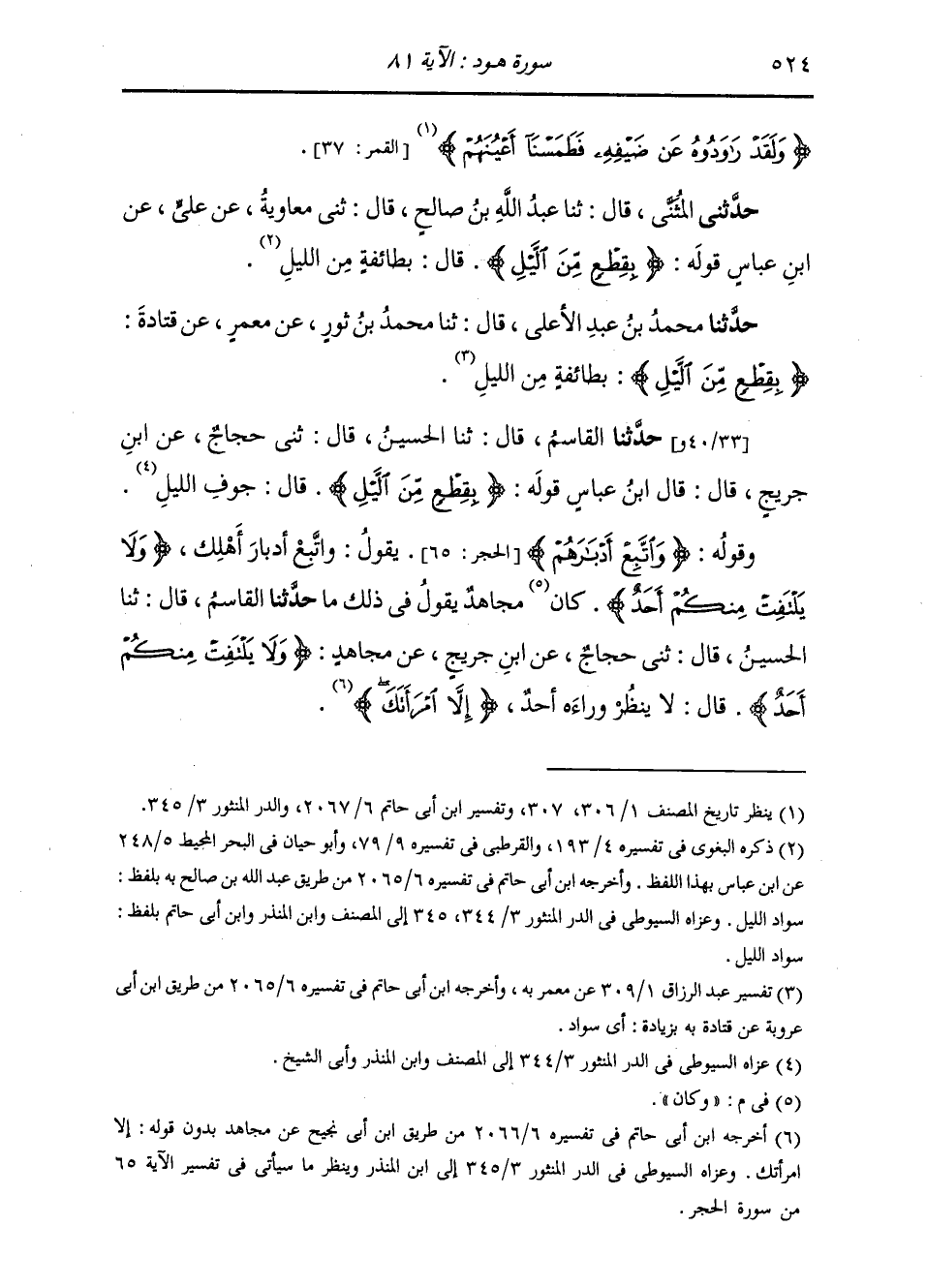 حَدَّثَنَا الْقَاسِمُ، قَالَ: ثَنَا الْحُسَيْنُ، قَالَ: ثَنِي حَجَّاجٌ، عَنِ ابْنِ جُرَيْجٍ، قَالَ: قَالَ ابْنُ عَبَّاسٍ، قَوْلُهُ:: " {§بِقِطْعٍ مِنَ اللَّيْلِ} [هود: 81] قَالَ: جَوْفِ اللَّيْلِ " وَقَوْلُهُ: {وَاتَّبِعْ أَدْبَارَهُمْ} [الحجر: 65] يَقُولُ: وَاتَّبِعْ أَدْبَارَ أَهْلِكَ، {وَلَا يَلْتَفِتُ مِنْكُمْ أَحَدٌ} [هود: 81] وَكَانَ مُجَاهِدٌ يَقُولُ فِي ذَلِكَ مَا: