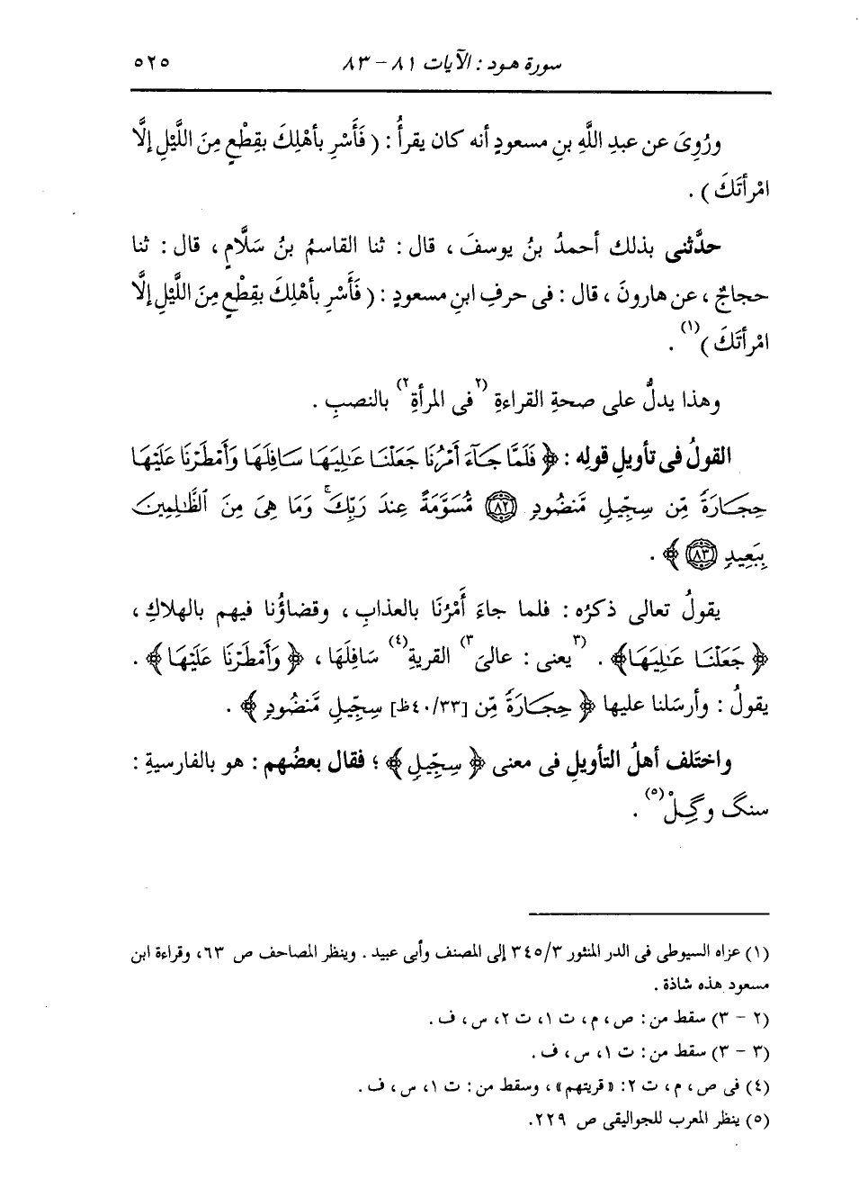 حَدَّثَنِي بِذَلِكَ أَحْمَدُ بْنُ يُوسُفَ، قَالَ: ثَنَا الْقَاسِمُ بْنُ سَلَّامٍ، قَالَ: ثَنَا حَجَّاجٌ، عَنْ هَارُونَ، قَالَ: " §فِي حَرْفِ ابْنِ مَسْعُودٍ: «فَأَسْرِ بِأَهْلِكَ بِقِطْعٍ مِنَ اللَّيْلِ إِلَّا امْرَأَتَكَ» وَهَذَا يَدُلُّ عَلَى صِحَّةِ الْقِرَاءَةِ بِالنَّصْبِ