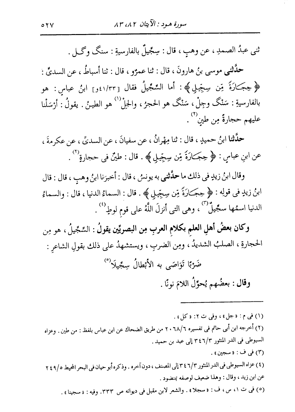 حَدَّثَنِي مُوسَى بْنُ هَارُونَ، قَالَ: ثَنَا عَمْرٌو، قَالَ: ثَنَا أَسْبَاطٌ، عَنِ السُّدِّيِّ: " {§حِجَارَةً مِنْ سِجِّيلٍ} [هود: 82] أَمَا السِّجِّيلُ فَقَالَ ابْنُ عَبَّاسٍ: هُوَ بِالْفَارِسِيَّةِ: سِنْكُ وَجُلُّ، سِنَّكَ: هُوَ الْحَجَرُ، وَجُلُّ هُوَ الطِّينُ، يَقُولُ: أَرْسَلْنَا عَلَيْهِمْ حِجَارَةً مِنْ طِينٍ "