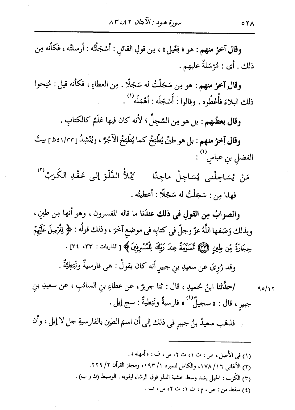 حَدَّثَنَا ابْنُ حُمَيْدٍ، قَالَ: ثَنَا جَرِيرٌ، عَنْ عَطَاءِ بْنِ السَّائِبِ، عَنْ سَعِيدِ بْنِ جُبَيْرٍ، قَالَ: «§فَارِسِيَّةٌ وَنَبَطِيَّةٌ سِجْ إِيلْ» فَذَهَبَ سَعِيدُ بْنُ جُبَيْرٍ فِي ذَلِكَ إِلَى أَنَّ اسْمَ الطِّينِ بِالْفَارِسِيَّةِ جَلَّ لَا إِيلْ، وَأَنَّ -[529]- ذَلِكَ لَوْ كَانَ بِالْفَارِسِيَّةِ لَكَانَ سِجِلًّا لَا سِجِّيلًا، لِأَنَّ الْحَجَرَ بِالْفَارِسِيَّةِ يُدْعَى سِجْ، وَالطِّينَ جَلَّ، فَلَا وَجْهَ لِكَوْنِ الْيَاءِ فِيهَا، وَهِيَ فَارِسِيَّةٌ. وَقَدْ بَيَّنَّا الصَّوَابَ مِنَ الْقَوْلِ عِنْدَنَا فِي أَوَّلِ الْكِتَابِ بِمَا أَغْنَى عَنْ إِعَادَتِهِ فِي هَذَا الْمَوْضِعِ. وَقَدْ ذُكِرَ عَنِ الْحَسَنِ الْبَصْرِيِّ أَنَّهُ قَالَ: كَانَ أَصْلُ الْحِجَارَةِ طِينًا فَشُدِّدَتْ وَأَمَّا قَوْلُهُ: {مَنْضُودٍ} [هود: 82] فَإِنَّ
