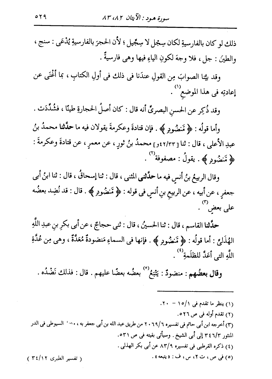 وَقَالَ الرَّبِيعُ بْنُ أَنَسٍ فِيهِ، مَا: حَدَّثَنِي الْمُثَنَّى، قَالَ: ثَنَا إِسْحَاقُ، قَالَ: ثَنَا ابْنُ أَبِي جَعْفَرٍ، عَنْ أَبِيهِ، عَنِ الرَّبِيعِ بْنِ أَنَسٍ، " §فِي قَوْلِهِ {مَنْضُودٍ} [هود: 82] قَالَ: نَضَدَ بَعْضُهُ عَلَى بَعْضٍ "