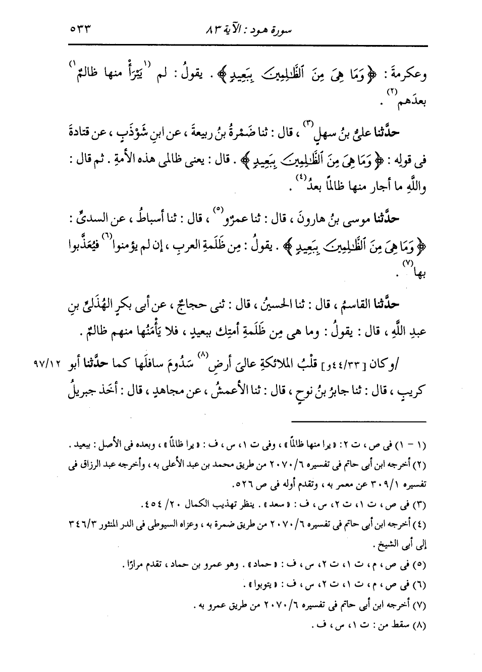 حَدَّثَنَا مُوسَى بْنُ هَارُونَ، قَالَ: ثَنَا ابْنُ حَمَّادٍ، قَالَ: ثَنَا أَسْبَاطٌ، عَنِ السُّدِّيِّ، " {§وَمَا هِيَ مِنَ الظَّالِمِينَ بِبَعِيدٍ} [هود: 83] يَقُولُ: مِنْ ظَلَمَةِ الْعَرَبِ إِنْ لَمْ يَتُوبُوا فَيُعَذَّبُوا بِهَا "