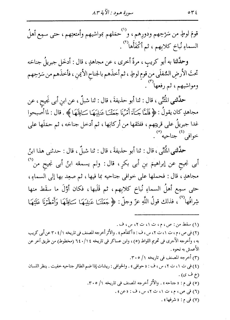 قَالَ: ثَنَا شِبْلٌ، قَالَ: فحَدَّثَنِي هَذَا ابْنُ أَبِي نَجِيحٍ، عَنْ إِبْرَاهِيمَ بْنِ أَبِي بَكْرٍ قَالَ: وَلَمْ يَسْمَعْهُ ابْنُ أَبِي نَجِيحٍ عَنْ مُجَاهِدٍ، قَالَ: " §فَحَمَلَهَا عَلَى خَوَافِي جَنَاحِهِ بِمَا فِيهَا، ثُمَّ صَعِدَ بِهَا إِلَى السَّمَاءِ حَتَّى سَمِعَ أَهْلُ السَّمَاءِ نُبَاحَ كِلَابِهِمْ ثُمَّ قَلْبَهَا، فَكَانَ أَوَّلُ مَا سَقَطَ مِنْهَا شُرَفَهَا، فَذَلِكَ قَوْلُ اللَّهِ: {جَعَلْنَا عَالِيَهَا سَافِلَهَا وَأَمْطَرْنَا عَلَيْهَا -[535]- حِجَارَةً مِنْ سِجِّيلٍ} [هود: 82] " قَالَ مُجَاهِدٌ: فَلَمْ يُصِبْ قَوْمًا مَا أَصَابَهُمْ؛ إِنَّ اللَّهَ طَمَسَ عَلَى أَعْيُنِهِمْ، ثُمَّ قَلَبَ قَرْيَتَهُمْ، وَأَمْطَرَ عَلَيْهِمْ حِجَارَةً مِنْ سِجِّيلٍ "