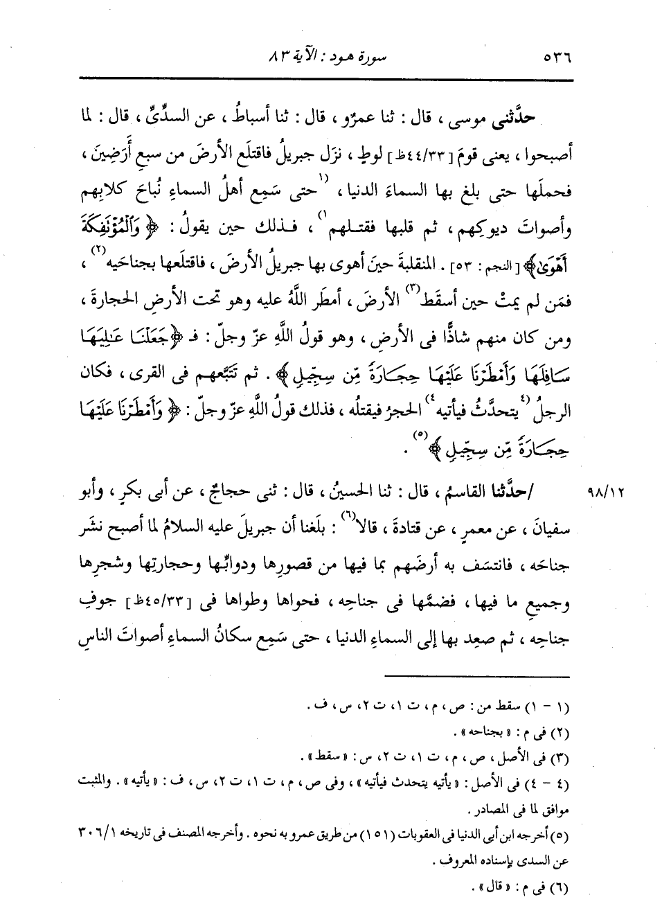 حَدَّثَنِي مُوسَى، قَالَ: ثَنَا عَمْرٌو، قَالَ: ثَنَا أَسْبَاطٌ، عَنِ السُّدِّيِّ، قَالَ: " §لَمَّا أَصْبَحُوا يَعْنِي قَوْمُ لُوطٍ نَزَلَ جَبْرَئِيلُ، فَاقْتَلَعَ الْأَرْضَ مِنْ سَبْعِ أَرَضِينَ، فَحَمَلَهَا حَتَّى بَلَغَ السَّمَاءَ الدُّنْيَا حَتَّى سَمِعَ أَهْلُ السَّمَاءِ نُبَاحَ كِلَابِهِمْ وَأَصْوَاتَ دِيُوكِهِمْ، ثُمَّ قَلَبَهَا فَقَتَلَهُمْ فَذَلِكَ حِينَ يَقُولُ: {وَالْمُؤْتَفِكَةَ أَهْوَى} [النجم: 53] الْمُنْقَلِبَةُ حِينَ أَهْوَى بِهَا جَبْرَئِيلُ الْأَرْضَ فَاقْتَلَعَهَا بِجَنَاحِهِ، فَمَنْ لَمْ يَمُتْ حِينَ أَسْقَطَ الْأَرْضَ أَمْطَرَ اللَّهُ عَلَيْهِ، وَهُوَ تَحْتَ الْأَرْضِ الْحِجَارَةِ، وَمَنْ كَانَ مِنْهُمْ شَاذًّا فِي الْأَرْضِ وَهُوَ قَوْلُ اللَّهِ: {فَجَعَلْنَا عَالِيَهَا سَافِلَهَا وَأَمْطَرْنَا عَلَيْهِمْ حِجَارَةً مِنْ سِجِّيلٍ} [الحجر: 74] ثُمَّ تَتَبَّعَهُمْ فِي الْقُرَى، فَكَانَ الرَّجُلُ يَأْتِيهِ الْحَجَرُ فَيَقْتُلُهُ، وَذَلِكَ قَوْلُ اللَّهِ تَعَالَى: {وَأَمْطَرْنَا عَلَيْهَا حِجَارَةً مِنْ سِجِّيلٍ} [هود: 82] "