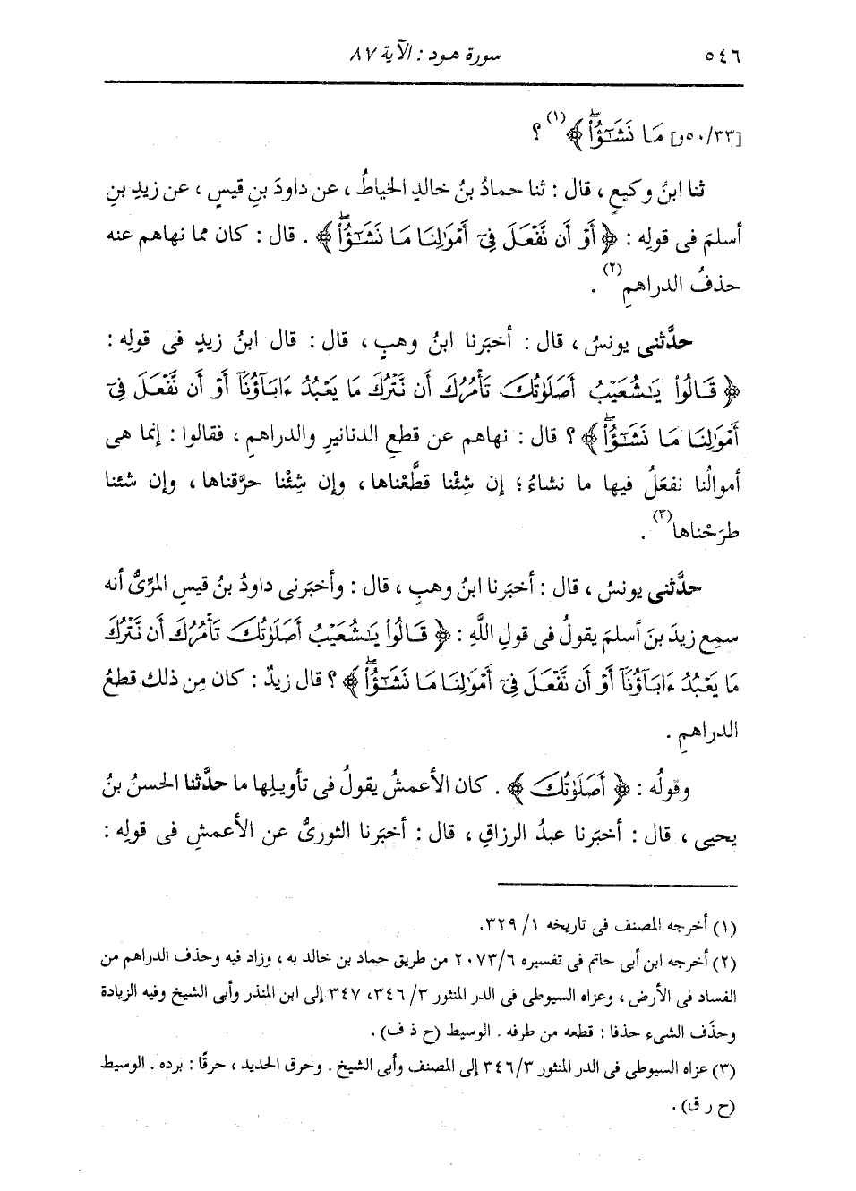 قَالَ: ثَنَا حَمَّادُ بْنُ خَالِدٍ الْخَيَّاطُ، عَنْ دَاوُدَ بْنِ قَيْسٍ، عَنْ زَيْدِ بْنِ أَسْلَمَ، فِي قَوْلِهِ: " {§أَوْ أَنْ نَفْعَلَ فِي أَمْوَالِنَا مَا نَشَاءُ} [هود: 87] قَالَ: كَانَ مِمَّا نَهَاهُمْ عَنْهُ: حَذْفُ الدَّرَاهِمِ "