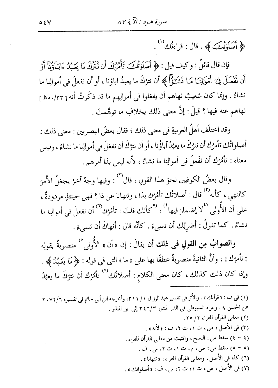 : " {§أَصَلَاتُكَ} [هود: 87] قَالَ: قِرَاءَتُكَ فَإِنْ قَالَ قَائِلٌ: وَكَيْفَ قِيلَ: أَصَلَاتُكَ تَأْمُرُكَ أَنْ نَتْرُكَ مَا يَعْبُدُ آبَاؤُنَا، أَوْ أَنْ نَفْعَلَ فِي أَمْوَالِنَا مَا نَشَاءُ، وَإِنَّمَا كَانَ شُعَيْبٌ نَهَاهُمْ أَنْ يَفْعَلُوا فِي أَمْوَالِهِمْ مَا قَدْ ذَكَرْتُ أَنَّهُ نَهَاهُمْ عَنْهُ فِيهَا؟ قِيلَ: إِنَّ مَعْنَى ذَلِكَ بِخِلَافِ مَا تَوَهَّمْتَ " وَقَدِ اخْتَلَفَ أَهْلُ الْعَرَبِيَّةِ فِي مَعْنَى ذَلِكَ، فَقَالَ بَعْضُ الْبَصْرِيِّينَ: مَعْنَى ذَلِكَ: أَصَلَاتُكَ تَأْمُرُكَ أَنْ نَتْرُكَ مَا يَعْبُدُ آبَاؤُنَا، أَوْ أَنْ نُتْرَكَ أَنْ نَفْعَلَ فِي أَمْوَالِنَا مَا نَشَاءُ، وَلَيْسَ مَعْنَاهُ: تَأْمُرُكَ أَنْ نَفْعَلَ فِي أَمْوَالِنَا مَا نَشَاءُ، لِأَنَّهُ لَيْسَ بِذَا أَمَرَهُمْ وَقَالَ بَعْضُ الْكُوفِيِّينَ نَحْوَ هَذَا الْقَوْلِ، قَالَ: وَفِيهَا وَجْهٌ آخَرَ يَجْعَلُ الْأَمْرَ كَالنَّهْيِ، كَأَنَّهُ قَالَ: أَصَلَاتُكَ تَأْمُرُكَ بِذَا وَتَنْهَانَا عَنْ ذَا؟ فَهِيَ حِينَئِذٍ مَرْدُودَةٌ عَلَى أَنَّ الْأُولَى مَنْصُوبَةٌ بِقَوْلِهِ «تَأْمُرُكَ» ، وَأَنَّ الثَّانِيَةَ مَنْصُوبَةٌ عَطَفًا بِهَا عَلَى «مَا» الَّتِي فِي قَوْلِهِ: {مَا يَعْبُدُ} [هود: 87] وَإِذَا كَانَ ذَلِكَ كَذَلِكَ، كَانَ مَعْنَى الْكَلَامِ: أَصَلَاتُكَ تَأْمُرُكَ أَنْ نَتْرُكَ مَا يَعْبُدُ