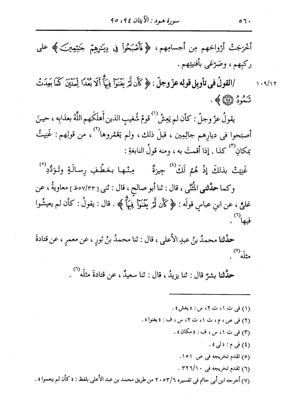 §الْقَوْلُ فِي تَأْوِيلِ قَوْلِهِ تَعَالَى: {كَأَنَّ لَمْ يَغْنَوْا فِيهَا أَلَا بُعْدًا لِمَدْيَنَ كَمَا بَعِدَتْ ثَمُودُ} [هود: 95] يَقُولُ تَعَالَى ذِكْرُهُ: كَأَنْ لَمْ يَعِشْ قَوْمُ شُعَيْبٍ الَّذِينَ أَهْلَكَهُمُ اللَّهُ بِعَذَابِهِ حِينَ أَصْبَحُوا جَاثِمِينَ فِي دِيَارِهِمْ قَبْلَ ذَلِكَ. وَلَمْ يَغْنَوْا، مِنْ قَوْلِهِمْ: غَنَيْتُ بِمَكَانِ كَذَا: إِذَا أَقَمْتَ بِهِ، وَمِنْهُ قَوْلُ النَّابِغَةِ: