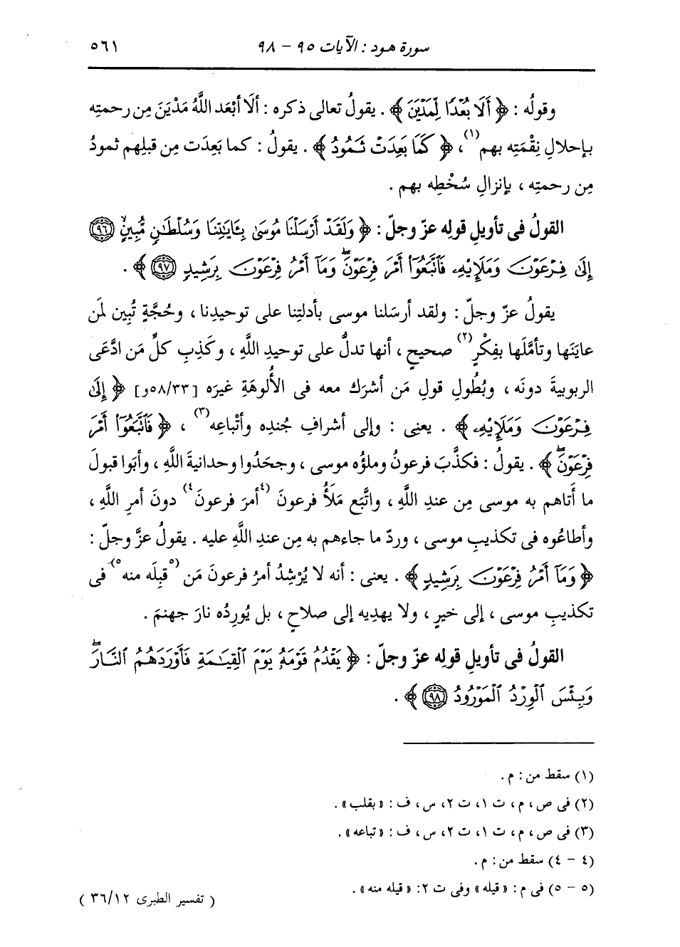 §الْقَوْلُ فِي تَأْوِيلِ قَوْلِهِ تَعَالَى: {وَلَقَدْ أَرْسَلْنَا مُوسَى بِآيَاتِنَا وَسُلْطَانٍ مُبِينٍ إِلَى فِرْعَوْنَ وَمَلَئِهِ فَاتَّبَعُوا أَمْرَ فِرْعَوْنَ وَمَا أَمْرُ فِرْعَوْنَ بِرَشِيدٍ} [هود: 97] يَقُولُ تَعَالَى ذِكْرُهُ: وَلَقَدْ أَرْسَلْنَا مُوسَى بِأَدِلَّتِنَا عَلَى تَوْحِيدِنَا، وَحُجَّةٍ تُبَيِّنُ لِمَنْ عَايَنَهَا، وَتَأَمَّلَهَا بِقَلْبٍ صَحِيحٍ، أَنَّهَا تَدُلُّ عَلَى تَوْحِيدِ اللَّهِ، وَكَذِبِ كُلِّ مَنِ ادَّعَى الرُّبُوبِيَّةَ دُونَهُ، وَبُطُولِ قَوْلِ مَنْ أَشْرَكَ مَعَهُ فِي الْأُلُوهَةِ غَيْرَهُ. {إِلَى فِرْعَوْنَ وَمَلَئِهِ} [الأعراف: 103] يَعْنِي إِلَى أَشْرَافِ جُنْدِهِ وَتُبَّاعِهِ. {فَاتَّبَعُوا أَمْرَ فِرْعَوْنَ} [هود: 97] يَقُولُ: فَكَذَّبَ فِرْعَوْنُ وَمَلَؤُهُ مُوسَى، وَجَحَدُوا وَحْدَانِيَّةَ اللَّهِ، وَأَبَوْا قَبُولَ مَا أَتَاهُمْ بِهِ مُوسَى مِنْ عِنْدِ اللَّهِ، وَاتَّبَعَ مَلَأُ فِرْعَوْنَ أَمْرَهُ دُونَ أَمْرِ اللَّهِ، وَأَطَاعُوهُ فِي تَكْذِيبِ مُوسَى وَرَدِّ مَا جَاءَهُمْ بِهِ مِنْ عِنْدِ اللَّهِ عَلَيْهِ يَقُولُ تَعَالَى ذِكْرُهُ: {وَمَا أَمْرُ فِرْعَوْنَ بِرَشِيدٍ} [هود: 97] يَعْنِي: أَنَّهُ لَا يَرْشُدُ أَمْرُ فِرْعَوْنَ مَنْ قَبِلَهُ مِنْهُ، فِي تَكْذِيبِ مُوسَى، إِلَى خَيْرٍ، وَلَا يَهْدِيهِ إِلَى صَلَاحٍ، بَلْ يُورِدُهُ نَارَ جَهَنَّمَ