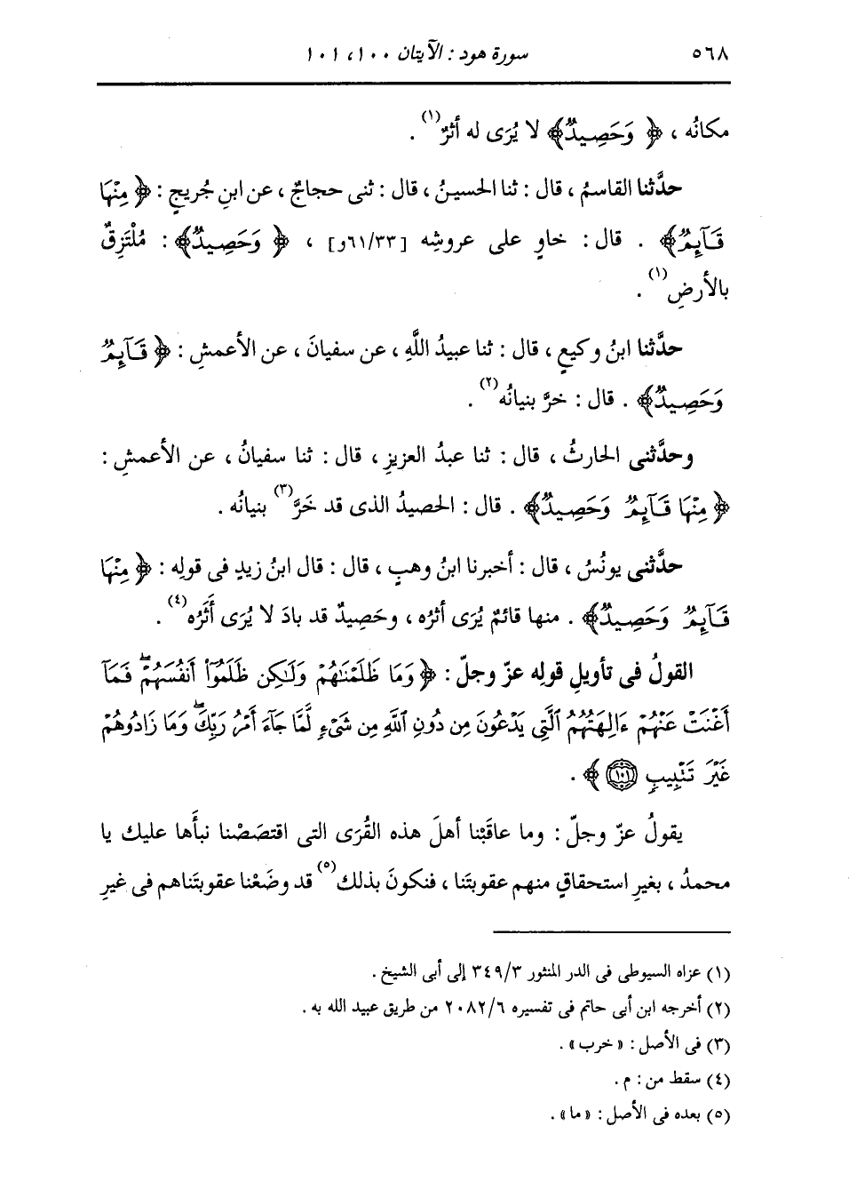حَدَّثَنَا الْحَارِثُ، قَالَ: ثَنَا عَبْدُ الْعَزِيزِ، قَالَ: ثَنَا سُفْيَانُ، عَنِ الْأَعْمَشِ: " {§مِنْهَا قَائِمٌ وَحَصِيدٌ} [هود: 100] قَالَ: الْحَصِيدُ: مَا قَدْ خَرَّ بُنْيَانُهُ "